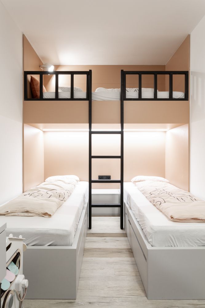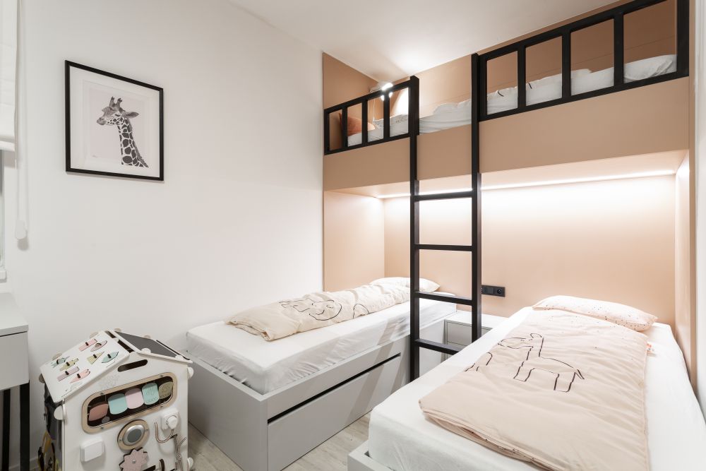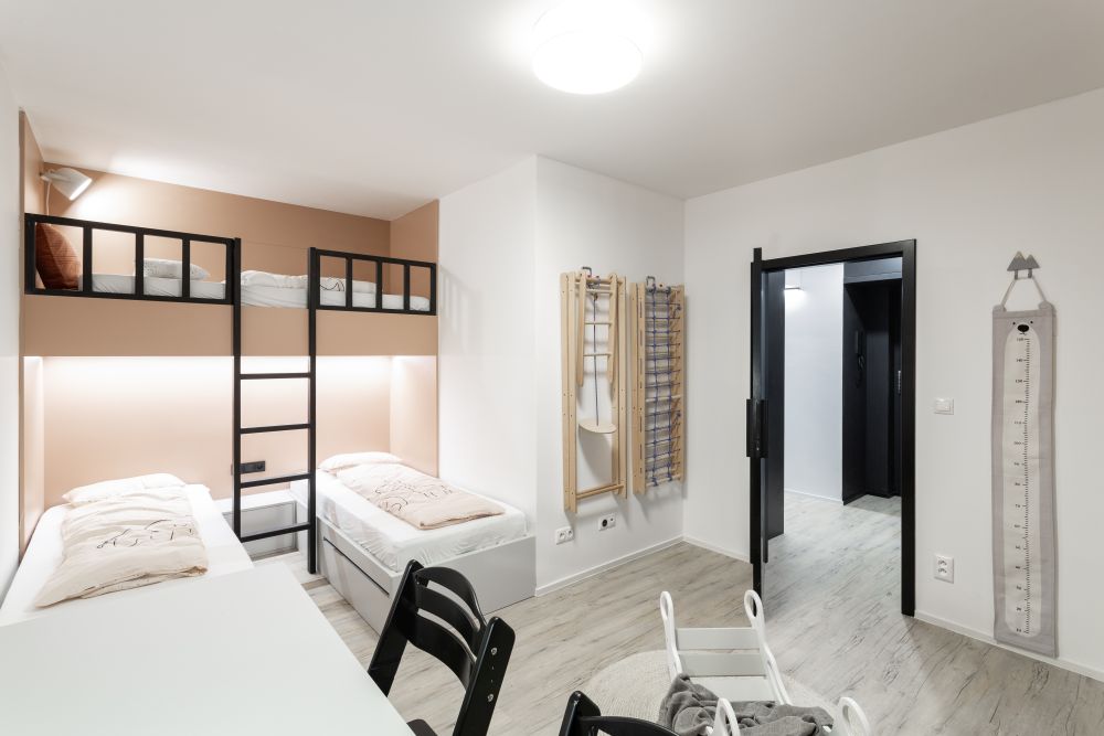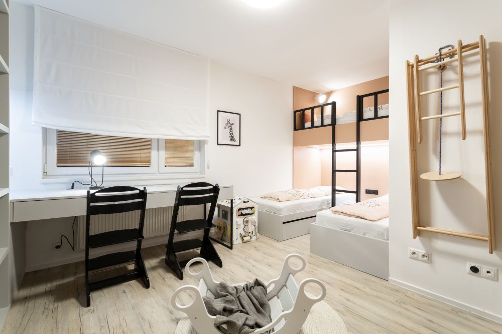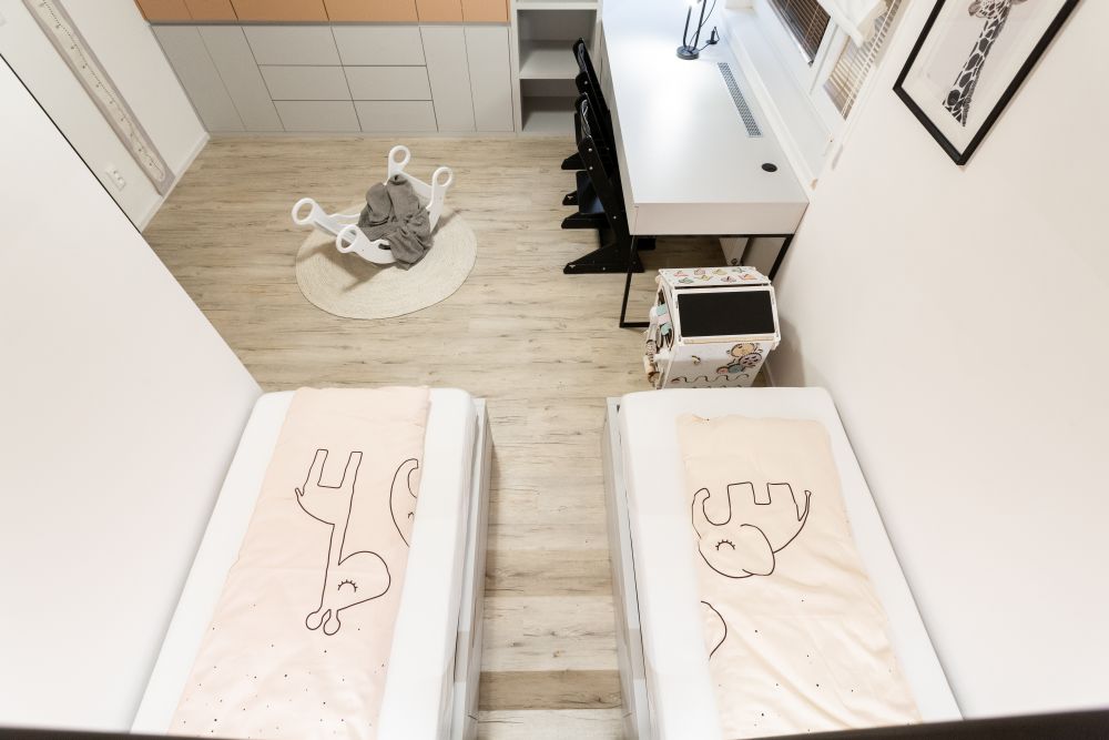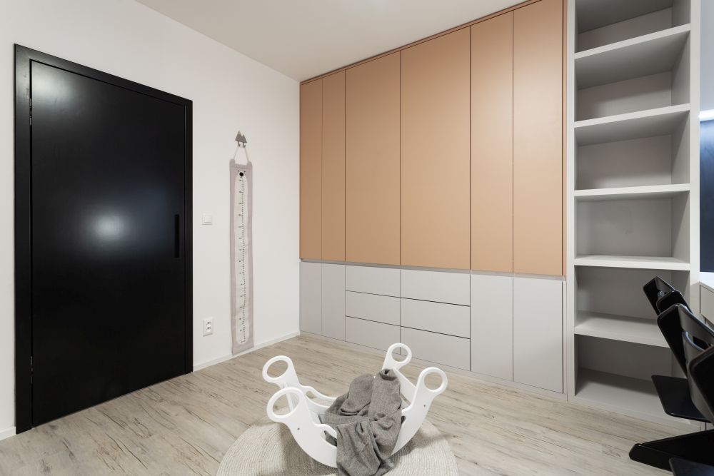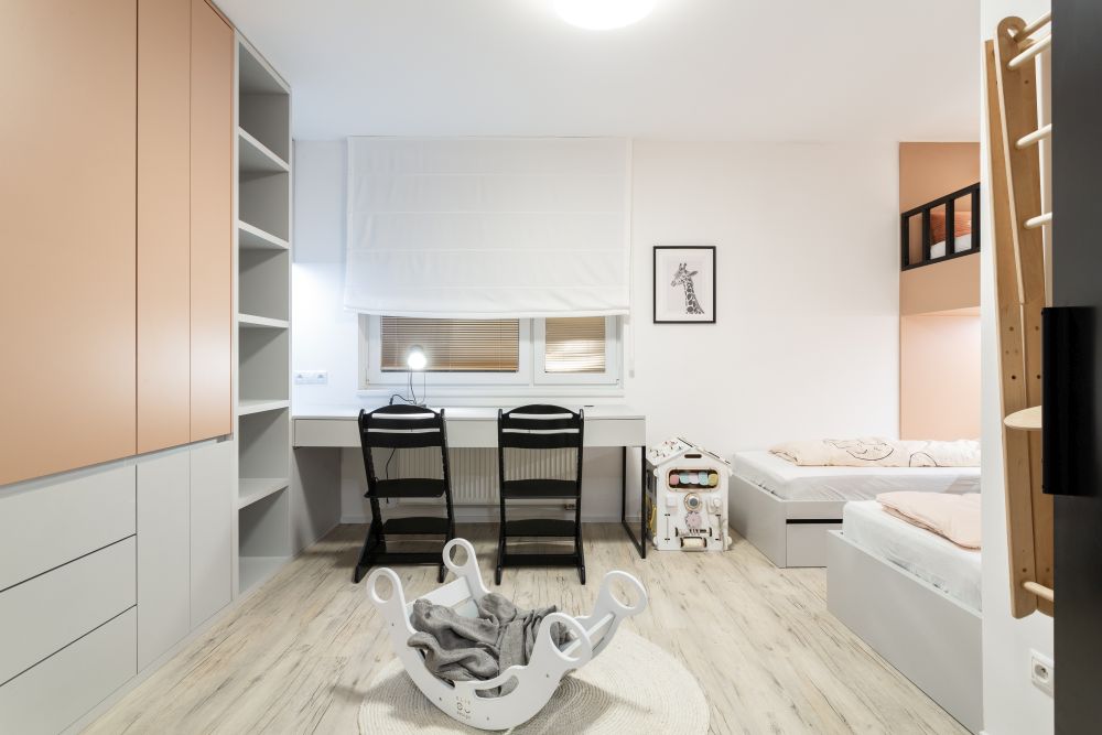 U holčiček jsme se chtěli vyhnout tradiční růžové a zvolili jsme jemnou pastelovou barvu oscilující někde mezi korálovou a lososovou. Celým bytem pak prochází vinylová podlaha v dekoru světlejšího dřeva s výraznou strukturou.