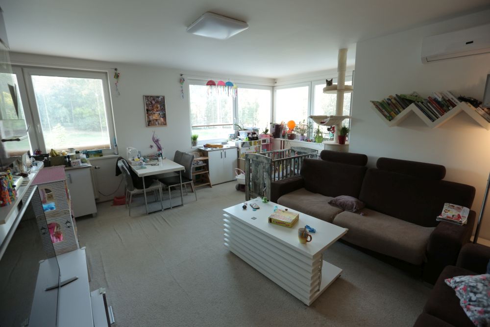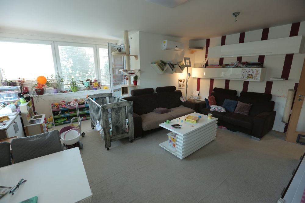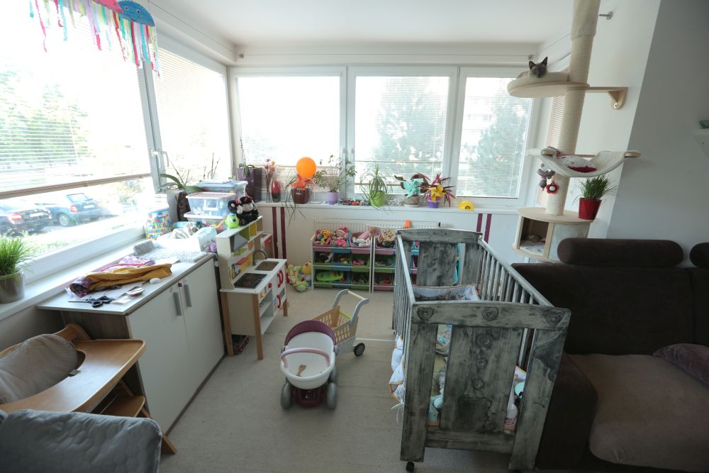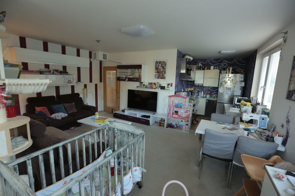 Byt se nachází v paneláku a jedná se o malé 2KK – obývák s kuchyňským koutem a rozkládací gauč, který už zažil své. Na něm Eva přespává. Gauč by měl být na každodenní spaní, ale není pohodlný, a tak si tam Eva nosí matraci. V obýváku s ní spí v postýlce zatím i nejmladší dcera. V chodbě stihli s manželem udělat nosný podhled. Pokojíček, kde dřív bývala manželská ložnice, slouží zatím dětem pouze k přespávání, a protože rodina nemá dostatek úložných prostor, ale hodně věcí, tak je to zároveň i takové skladiště.