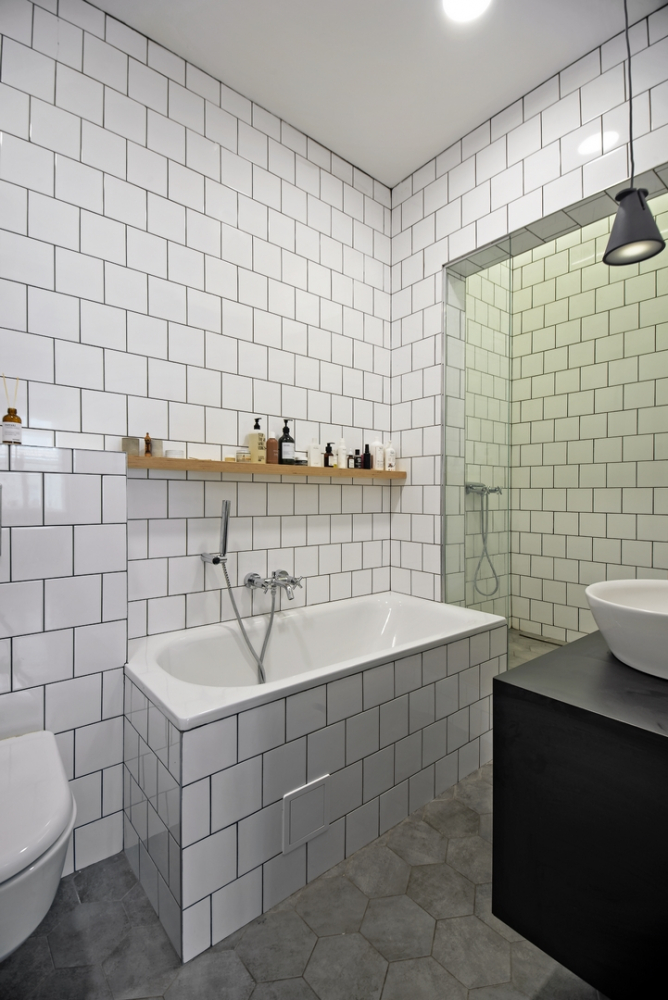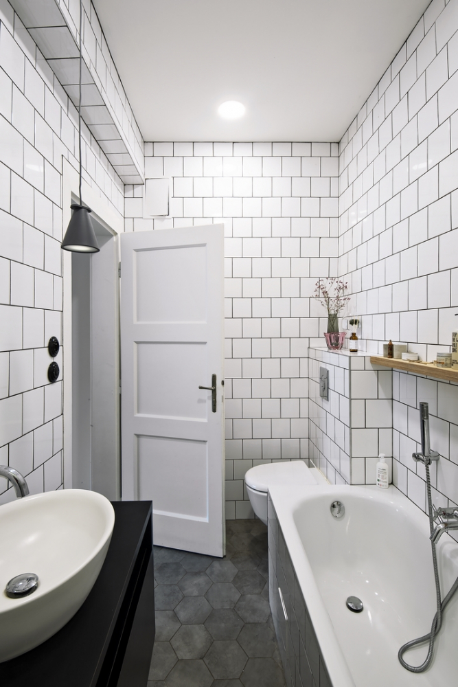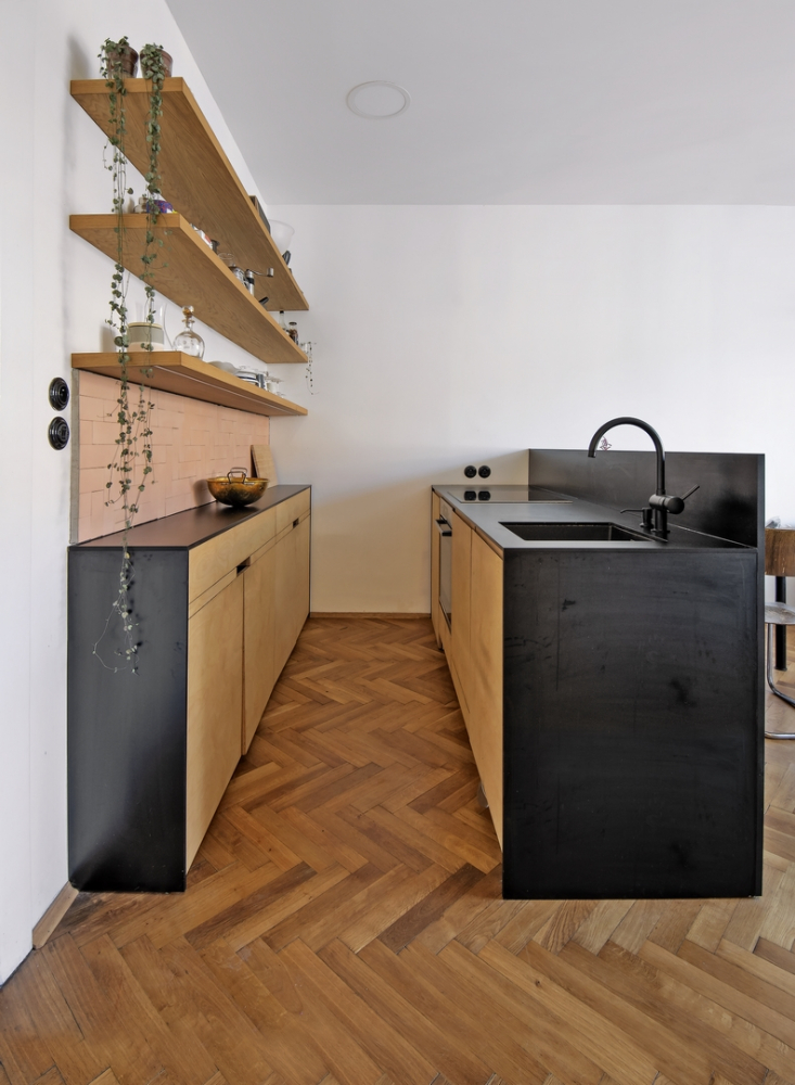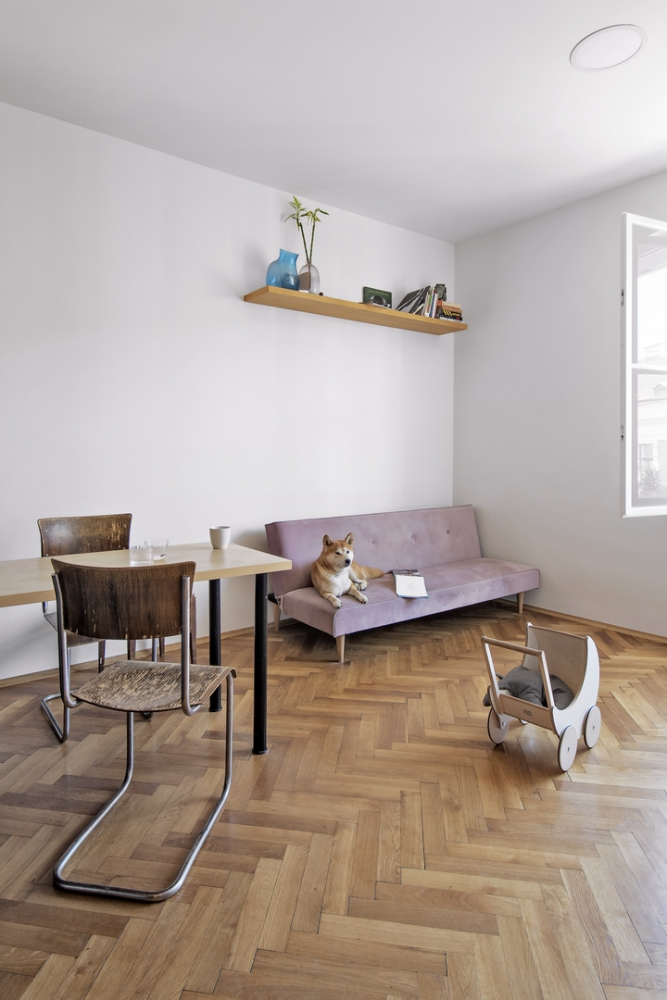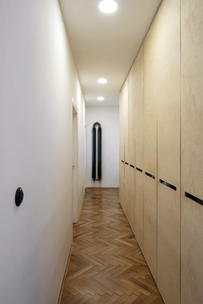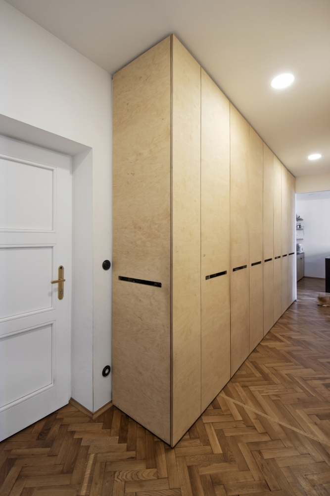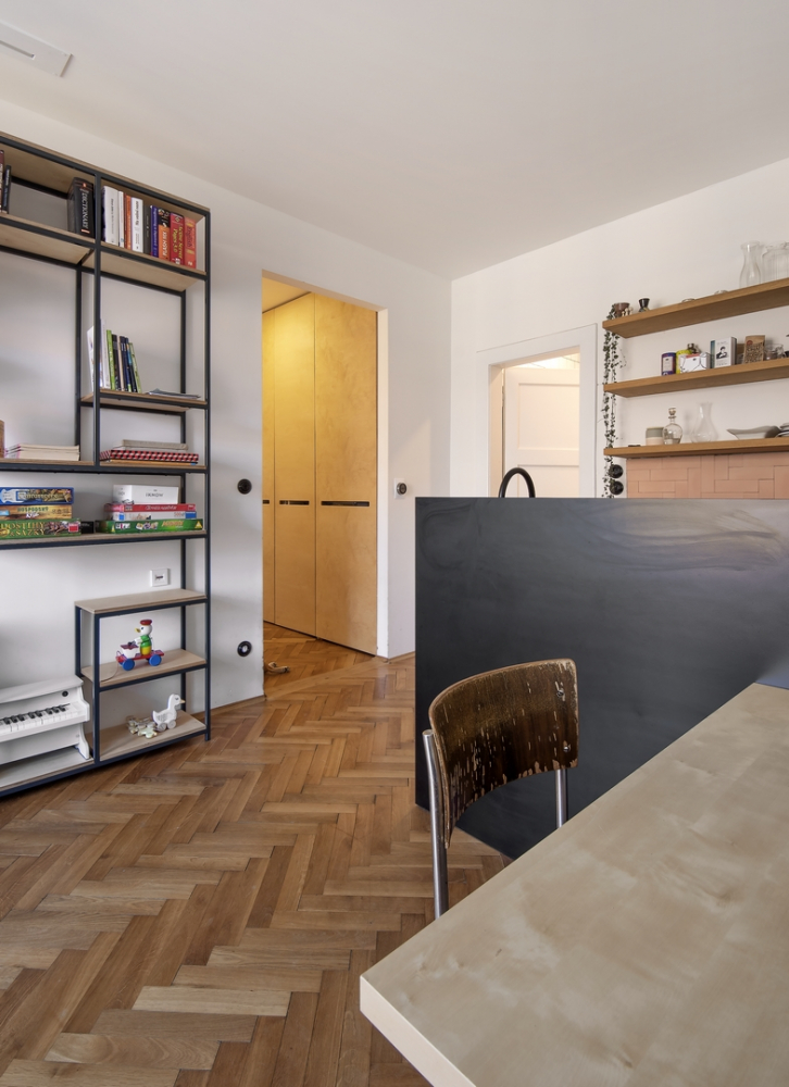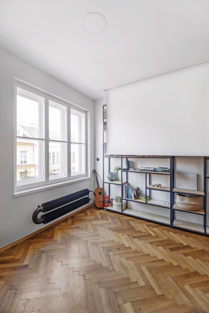 Na podlahách byly ponechány zachovalé původní parkety, v ložnici jsou položené nové dubové parkety. I když bourání a stavební práce byly relativně malé, velkou proměnou prošla zdravotechnika a vytápění, nové jsou veškeré elektroinstalace. V nově určené dispozici 3 + kk je páteří bytu chodba s vysokými úložnými skříněmi z březové překližky, v nichž je ukrytá i pračka, sušička, vestavný koš na prádlo, kotel a bojler.