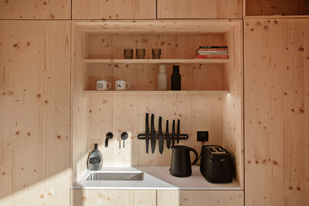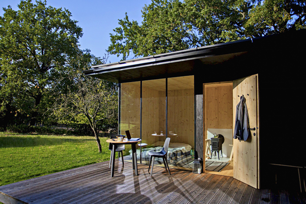 Ještě to ale chtělo pozemek, ideálně někde na samotě u lesa. Měl štěstí a od známého si přesně takový pronajal. Rozlehlý pozemek se sadem ovocných stromů a lesem na jeho druhém konci se nachází u bývalé hájovny. Chatka měla být co nejjednodušší, soběstačná a svým provozem co nejšetrnější k přírodě. Projekt je od architektonického studia, které provedlo i realizaci stavby. Nebylo to nic složitého, takže se na stavbě mohl částečně podílet i sám majitel a za týden bylo hotovo. Jde o dřevěnou „skládačku“ s fasádou ze smrkového dřeva postavenou na terase ze sibiřského modřínu. V chatce najdete vestavěnou kuchyňku, jídelní minikoutek, japonský futon na spaní, koupelnu se sprchou a suchou toaletou, na terase pak ještě finskou saunu pro dvě osoby.