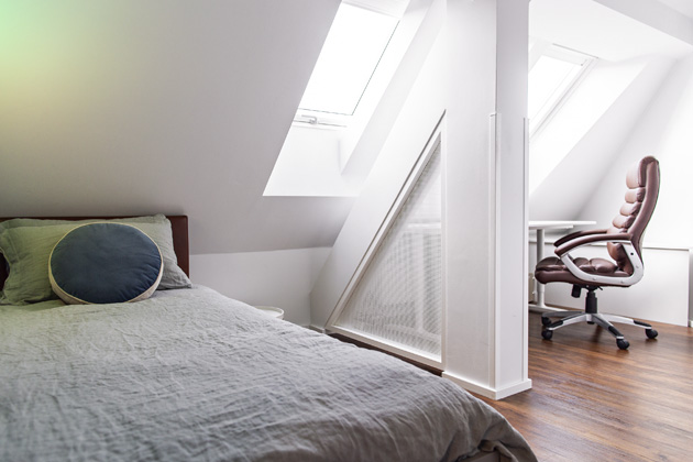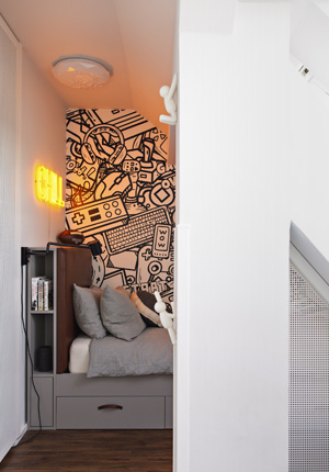 Nové podkrovní prostory včetně dvou pokojů proměnila designérka v útulný a stylový prostor pro dva teenagery. Původní chaotický interiér plný hraček a různorodého nábytku nahradily funkční a sjednocené místnosti, které mají charisma a kde se každý z chlapců může věnovat svým zálibám.
