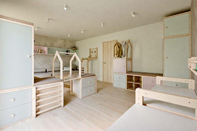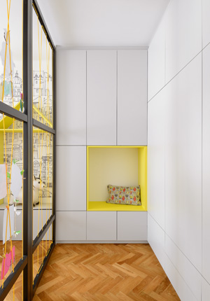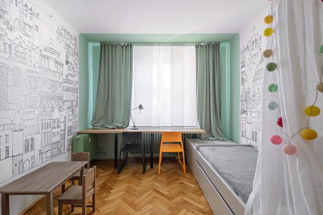 Pokojíček pro čtyřletou holčičku je součástí malého bytu 2+1. Při jeho navrhování designérka myslela i na to, že rodiče plánují ještě jedno dítě. Do pokoje umístila velkou skříň, kde část oblečení skladují i rodiče, a lehkou dřevěnou konstrukcí s provázky, na které lze kolíčky věšet obrázky, částečně oddělenou šatnu. Tento prvek dodává pokoji nejen funkčnost, ale i možnost vizuálního odclonění prostoru. Pod oknem je umístěn velký stůl, ke kterému se v budoucnu pohodlně usadí dvě děti. Pracovní zónu zvýraznila zelenou barvou, což má nejen praktický účel, ale i estetický. Okno je orientované na západ, a když teplé světlo prochází skrz zelený rám, opticky se světlo trochu ochladí.