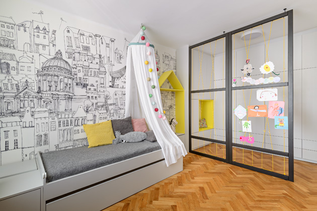 Pro větší soukromí holčičky slouží baldachýn, který promění postel v útulný domeček. Pod lůžkem je výsuvný šuplík, který slouží jako postel pro návštěvy nebo pro tatínka, až se narodí sourozenec. Vedle postele se nachází další nika ve tvaru domečku, která je myšlena jako budoucí čelo druhé postele. Skříňka pod nikou je zároveň výklopným peřiňákem. Edukativní tapetu designérka nakreslila technikou perokresba. Do koláže domů propašovala ikony architektury nebo památky, které si malé obyvatelky pokojíčku mohou lehce dobarvit.