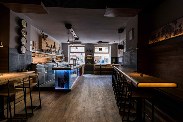 „Nebaví mě místa, která jsou stejná jako ostatní, nezajímavá, nudná,“ říká k tomu Martin Chmelík. S kamarádem Michalem Krejcarem proto vymysleli interiér, který se neokoukal ani po sedmi letech. Čisté linie a použití kvalitních materiálů, především jasanového dřeva, působí v porovnání s levným nábytkem a reklamními ubrusy, běžným standardem pivnic a hospod, jako zjevení. Nábytek vyrobený Michalem Krejcarem z Utopia factory potěší dokonalostí linky vedoucí od kuchyně až k výčepnímu pultu. Stoly s podsvícenými bočními hranami jako by na jedné straně ustupovaly a na druhé se rozvíjely tak, aby vytvořily širokou cestu napříč lokálem.