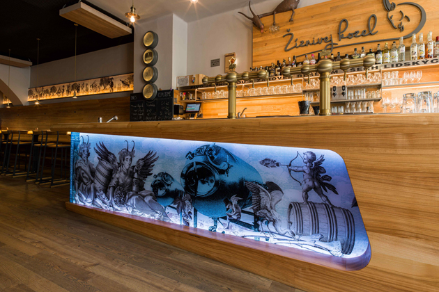 V Klatovech uhasíte žízeň, a ještě se budete cítit jako v galerii. Pivnice Žíznivej kozel dostala k sedmým narozeninám nový výčepní pult. Dvě z jeho stěn oživuje originální grafika tištěná na skle, dílo Martina Kaisera, držitele Ceny České filmové a televizní akademie za nejlepší filmový plakát. Rohaté postavičky s křídly, a vůbec celý ten zobrazený vtipný chaos, ožívá podsvícením. Uměleckou grafiku přenesla na bezpečnostní sklo technologie IZOS Design v závodě HELUZ IZOS.