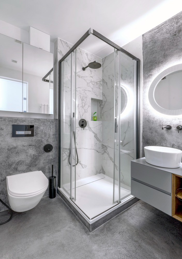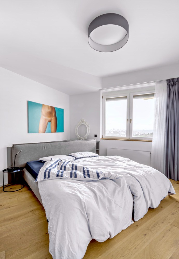 Aby se výsledek přiblížil představám, bylo nutné v deset let starém bytě udělat dost malých i razantních úprav. Mezi drobné zásahy s velkým efektem patřil nátěr rámů u oken v obýváku. Hnědá barva se přetřela na bílo, což pomohlo více otevřít krásný výhled do krajiny, a přirozeně tak propojit exteriér s interiérem. Pak už přišly na řadu větší zásahy, mezi něž patřila i změna dispozice. Bourali se příčky mezi stávající kuchyní a chodbou, aby se prostor bytu více otevřel a byl vzdušnější. Měnila se i dispozice koupelen a z jedné koupelny a samostatné toalety vznikly dvě koupelny. Pro majitele je určená koupelna s vanou, pro dcery a případné návštěvy je druhá koupelna se sprchovým koutem. Dále bylo nutné vymyslet úložné prostory, které řeší vestavěné skříně na míru. K ukládání věcí, jako je třeba vysavač, slouží malá komora na chodbě. V celém bytě se měnily i povrchové krytiny. Na terasu se dávala nová dlažba, do pokojů a na chodbu přišla položit dřevěná třívrstvá dubová podlaha. Mezi luxusní materiály patří stěrka Betonepox od firmy Němec, která zdobí koupelny a zeď za kuchyňskou linkou a za televizí.
