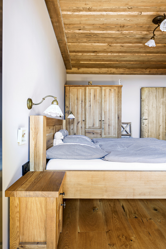 Dřevo bylo tedy jasnou volbou, ale jak budou konkrétní věci vypadat, to se rodilo dost dlouho a výhradně svépomocí, vyjma dokonalých služeb úžasného truhláře. Já jsem třeba něco vymyslela, ženskou rukou nakreslila a manžel to překreslil do odborné roviny, protože na to má vzdělání. Společně jsme pak věci konzultovali a dolaďovali s truhlářem, který to s námi všechno hodně prožíval a tvořil opravdu srdcem. Asi jsme byli inspirací i pro něj, protože se se svojí ženou shodli na to, že co se nám nebude líbit, to si vezmou k sobě domů. Nám se ale líbilo všechno.“