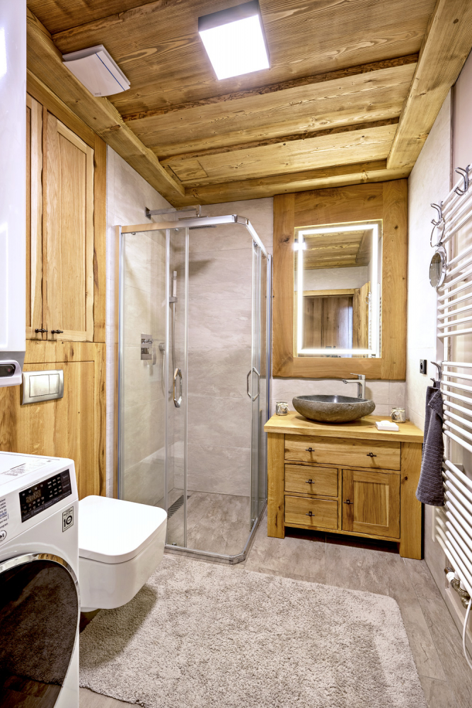 Dřevěnou podlahu do obytného prostoru a ložnice jsme vybrali v podlahovém studiu. V chodbě a v koupelně je z praktických důvodů položená dlažba. Teď už si to tady jen hýčkáme, užíváme a sem tam dokoupíme nějakou stylovou drobnost, která nám dotváří atmosféru. Když nerelaxujeme pod střechou v našem druhém domově, v zimě vyrážíme na běžky nebo na sjezdovky, které nazouváme rovnou před domem, v létě zdoláváme hory na kolech, užíváme si pěších výletů do kopců a sbírání hub a borůvek.“