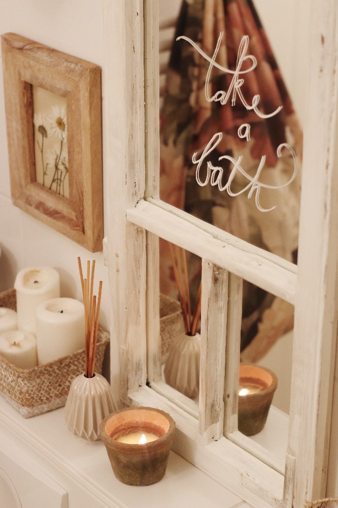 Vyzařuje z ní totiž naprostá pohoda, uvolněnost a klid. Zkrátka koupelnové hygge jak má být. Aby také ne. Atmosféře totiž významně napomáhá nespočet svíček, rustikálních rámů a měkkých textilií.