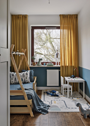 V perfektní harmonii s prostorem jde také dřevěný nábytek v retro stylu, díky kterému na místě vzniká jedinečná souhra stylů. Zdařilé designové podoby se dostalo také oběma dětským pokojíčkům. Jeden z nich opanovala petrolejová výmalba v kombinaci s hořčicově žlutým závěsem a hravým rámem postele z masivního dřeva.