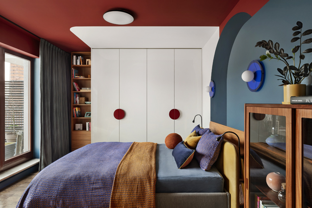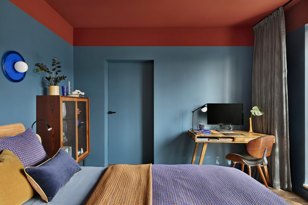 V hlavní ložnici si architekti kromě barev pohráli také s geometrickými tvary, a tak v podstatě nelze přehlédnout lehký dotyk Bauhausu v nečekaně atraktivní zemité podobě. Tmavé odstíny námořnické modré dodávají pokoji zcela nezaměnitelný charakter, stejně jako vínový strop a ladící akcenty. Epizodní roli pak i v tomto prostoru dostala bílá – své přednosti vystavila na odiv díky skříni a přiléhající části výmalby.
