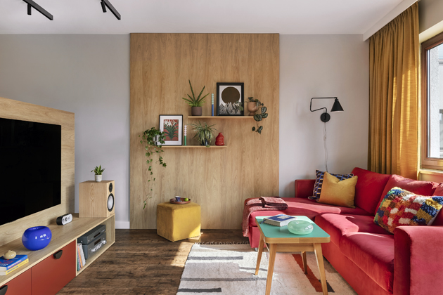 V rezidenčním komplexu Barciński Park v polské Lodži vznikl na ploše 82 m2 hravý byt. Díky odvážné volbě barev a specifické práci s prostorem to skoro působí, jako byste mohli slyšet barvy a vidět zvuk.