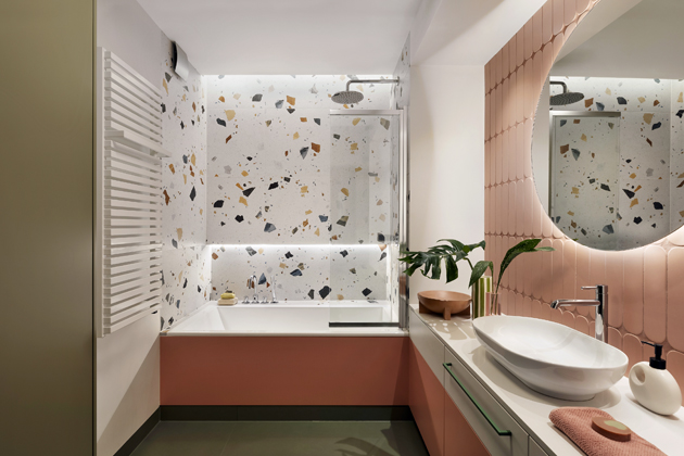 Při návrhu koupelny architekti uplatnili o poznání jemnější barevný přístup. Pastelově růžové keramické obklady s atypickým profilem doplnili velmi výrazným teracem v prostoru vany. Výmalba a vybavení v bílé pak celému prostoru dodávají na lehkosti a svěžesti. I v koupelně se přitom našel prostor pro zelenou, která v různých variacích prostupuje celým bytem. Projevila se na podlaze i na nábytku ukrývajícím potřebné elektro spotřebiče.
