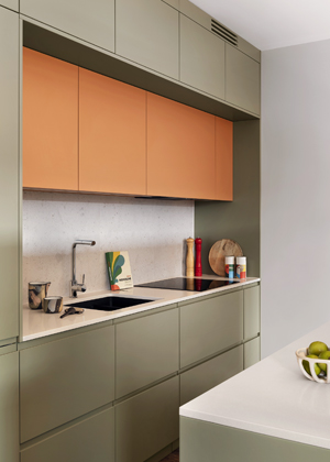 Všechny komponenty pak společně vytvářejí hřejivou a útulnou atmosféru, která přímo zve k ničím nerušené relaxaci na zcela nepřehlédnutelné červené pohovce. Neotřelých barevných kombinací se autoři nebáli ani na kuchyňské lince – na skříňkách zkombinovali zelenou s oranžovou, čímž do interiéru vnesli mimořádnou dynamiku. Pomyslnou třešinkou na dortu je pak v kuchyni kontrastně bílá pracovní deska z bílého křemenného granitu – ta je vedle svého elegantního designu také mimořádně odolná.