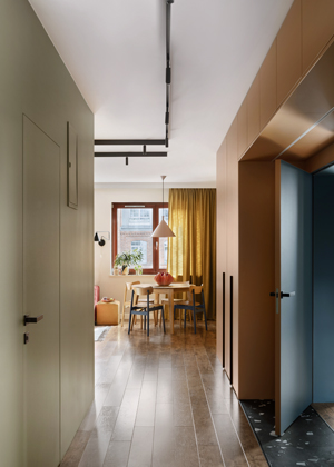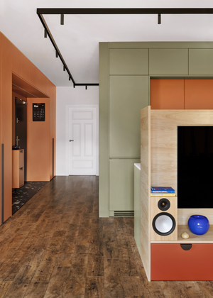 Dominantní část bytu tvoří vzdušný obývací pokoj, který společně s kuchyní vytváří maximálně funkční prostor. Místnosti od sebe jen symbolicky odděluje nízká příčka s integrovanou televizí. Obytné části vládne odvážná barevná paleta, která se potkává s tlumenými odstíny šedé na stěnách a jemným dřevodekorem.