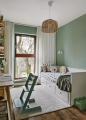 Ten druhý, pro starší z ratolestí, kombinuje přírodní tóny se šalvějově zelenou. Na zajímavosti mu pak dodává také rozměrné okno s výhledem do korun stromů. Ani v jednom z pokojů pak nechybí praktická řešení úložného prostoru, jako jsou vestavěné police a skříně. Díky tomu má každé z dětí dostatek úložného prostoru a estetika pokojíčku nijak neutrpěla.