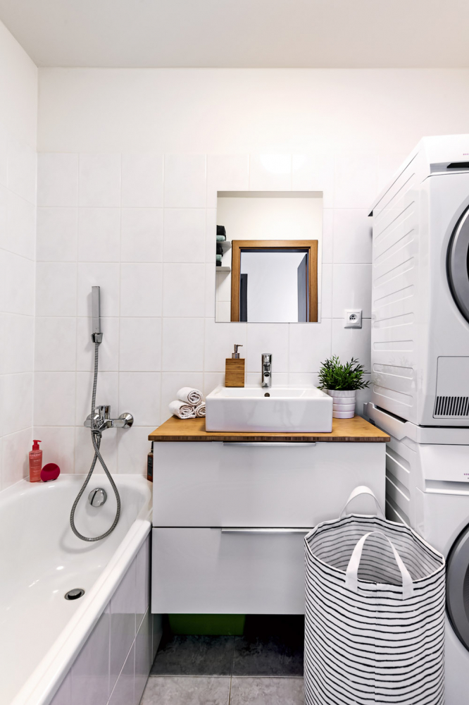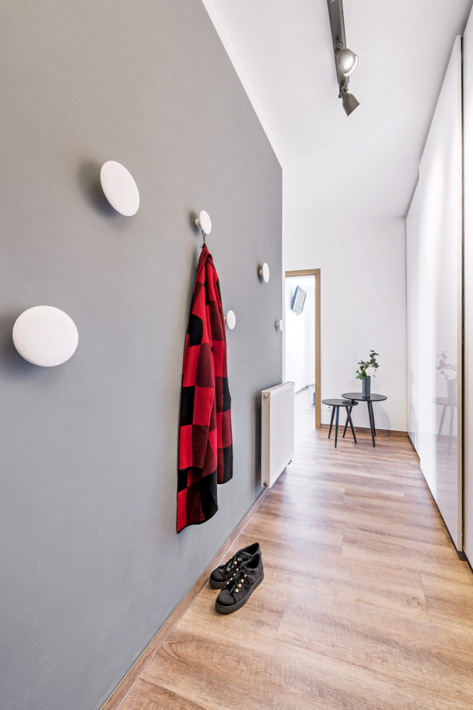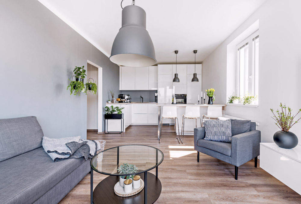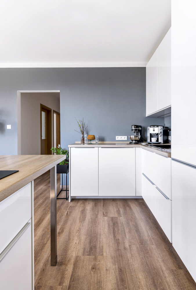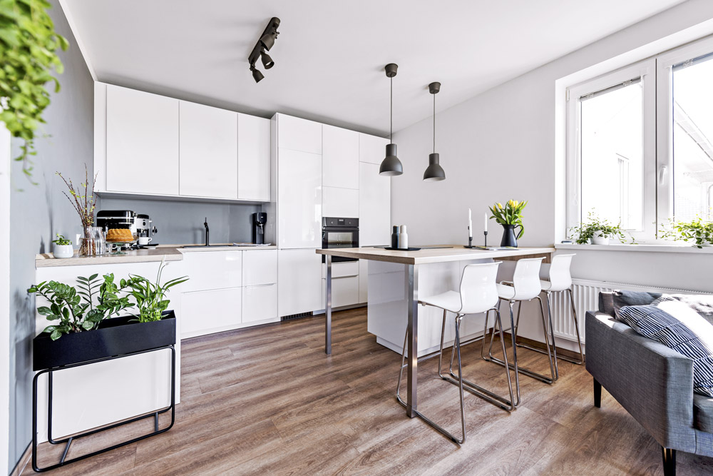 Sředobodem hlavní obytné místnosti je bílá lesklá kuchyň s hladkými dvířky z IKEA, kterou si Aneta sama navrhla. Varné centrum a jídelnu soustředila do ostrůvku. Téměř veškeré další zařízení je z obchodního domu IKEA, vestavěné skříně a doplňky třeba v podobě černého květníku či bílých dřevěných věšáčků jsou vyrobeny na zakázku.
