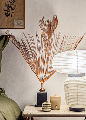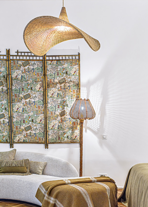 Stropní svítidla jsou všechna vyrobena z přírodních materiálů nebo z papíru. Stolní lampy jsou taková harmonická všehochuť – v obývacím pokoji jsem použil mosazné a skleněné lampy z 50. let, zakoupené ve starožitnictvích v Praze, a ručně vyráběné keramické lampy. Do ložnice jsem zvolil jak vysoké stojací, tak drobné stolní lampy. Zastupují 60. léta, orient i dávnou historii. A skvěle spolu fungují.