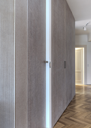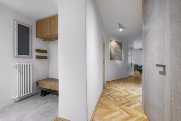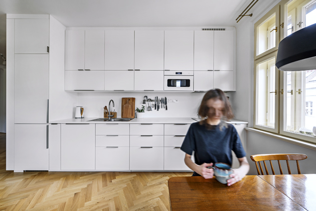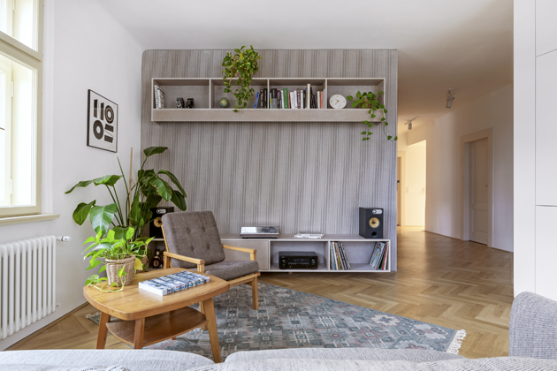 Foto: Lukáš Hausenblas Na podlahu se pokládaly dřevěné dubové parkety, repasovala se špaletová okna a některé dveře i s kováním, mezi stropem a stěnami se vytvořily fabiony (obloučky) a instalovaly se žebrované retro radiátory. Zásadně bylo ale potřeba změnit dispozici. Po vybourání většiny nenosných příček vznikl polygonální prostor obvodových stěn s mnoha různými úhly. Množství těchto úhlů brali architekti jako benefit a vybudovali v bytě nepravidelnou a lomenou chodbu, z níž vedou dveře do jednotlivých pokojů. Touto zásadní úpravou vznikla dispozice 3+kk, přičemž hlavní obytná místnost s kuchyní jídelnou a obývákem je situovaná do nejhezčího prostoru v nároží domu s okny do tří stran. Hlavním dominantním prvkem v bytě je lomená nábytková stěna na celou výšku bytu, která prochází z jedné strany chodbou až do obývacího pokoje. V tomto vloženém bloku z bělených MDF desek jsou rafinovaně ukryty úložné prostory, komora, skryté dveře do ložnice a pracovny, taktéž rozvody pro audiovizuální stěnu v obývacím pokoji.