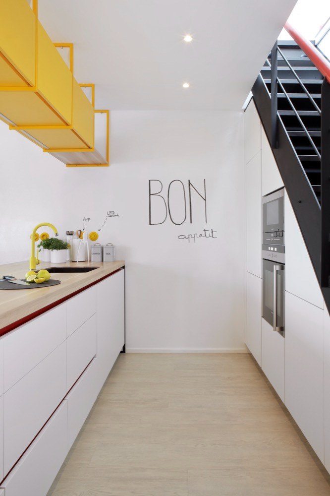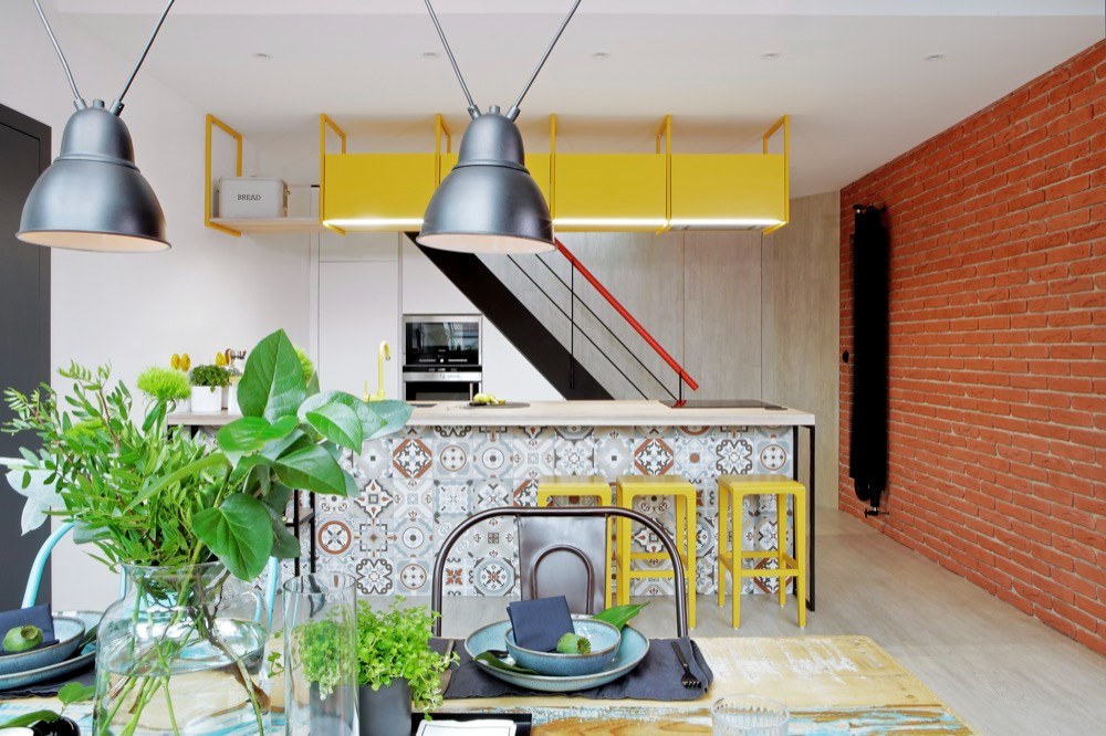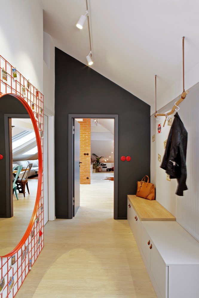 První kolo návrhů majitele neuspokojilo, a tak bylo nutné lépe se vzájemně pochopit a na návrhu ještě zapracovat. V druhém kole už ve studiu připravili interiér, který majitelům naplnil jejich představy. Stál před nimi ale nelehký úkol, neboť se museli vejít do určitého rozpočtu a ve finále řešit každou položku. Také vize klientů byla velmi citlivá na detaily, takže se hodně hledaly alternativy, další varianty a změny. Z určitých důvodů dostal projekt na čas stopku, ale po novém odstartování trvala rekonstrukce 7 měsíců, z toho 4 měsíce byly stavební. Majitelé mají rádi barvy, a proto chtěli mít domov barevný a veselý. Jsou také vášniví cestovatelé, cyklisté a preferují přírodní materiály. Jejich hravý přístup k interiéru se designéři snažili vtisknout hlavně do doplňků a dekorací. Proto v zádveří vzniklo červené zrcadlo na kari síti, na němž jsou kolíčky připevněné fotky z cest. Proto jsou v celém bytě vidět špalky, větve, kůže atd. Hezkým detailem jsou i barevné porcelánové vypínače od české značky Katy Paty.