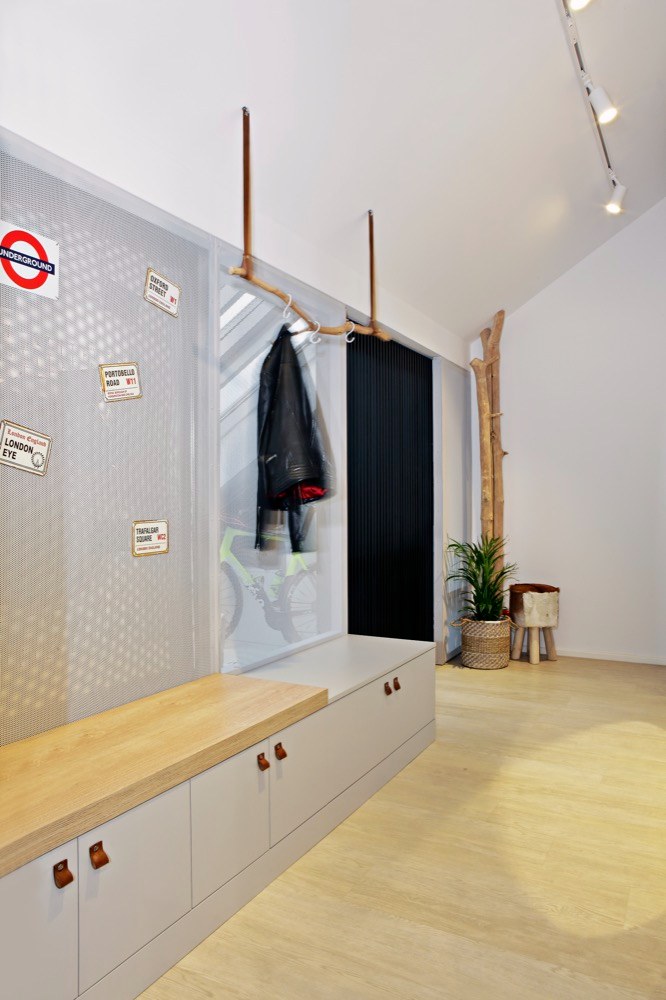 Na první pohled bylo jasné, že budeme muset prostor konstrukčně očistit a vyměnit základní povrchy a materiály. To se týkalo schodiště, podlahy a radiátoru v kuchyni. Stavebně jsme upravili vzhled SDK podhledů, příčky nad kuchyní a protáhli příčku v obytném prostoru, čímž jsme více oddělili TV stěnu od kuchyňské a jídelní části. Na tuto stěnu jsme použili cihlový obklad. Revoluční změnou byla dispozice zádveří. Původně jednu místnost jsme rozdělili příčkou, před níž vzniklo místo na příchod, manipulaci a odložení věcí, za ní se vytvořil prostor se šatními skříněmi a místo na kola. Velkou změnou prošla také dispozice kuchyně, kdy se původní situování sestavy do L s volně stojícím ostrůvkem změnilo na dva rovnoběžné bloky. Do konceptu se vůbec nehodily stávající bezfalcové dveře podýhované americkým ořechem. Aby se nemusely měnit, vyřešilo se to polepem dveří speciální fólií, která dovolila různou barevnost. Měnilo se i dveřní kování. Budoucí podlahu jsme zvolili vinylovou s pevnou pokládkou lepeným způsobem. Na konci obýváku jsme srovnali schod, který byl původně rozdělený do více zlomů. Podlahu jsme kompletně sjednotili kromě koupelny, kde zůstala dlažba. Velkou změnou prošla také ložnice, jež zápasila s úložným prostorem. Původní volně stojící skříně jsme proto nahradili kompaktním úložným prostorem, vytvořeným podél stěn, a místnost tak opticky „uklidnili“.