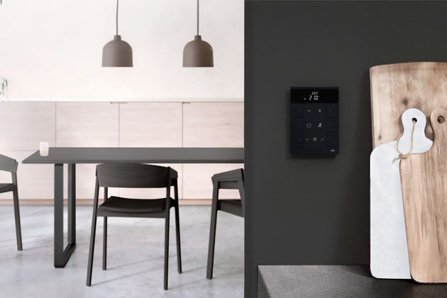 Multifunkční ovládací prvek Tenton (ABB)začleněný do systému chytré domácnosti ABB-free@home umí řídit všechny prvky domácnosti, osvětlení, stínění, teplotu, vlhkost i množství CO2, nizke-napeti.cz.abb.com