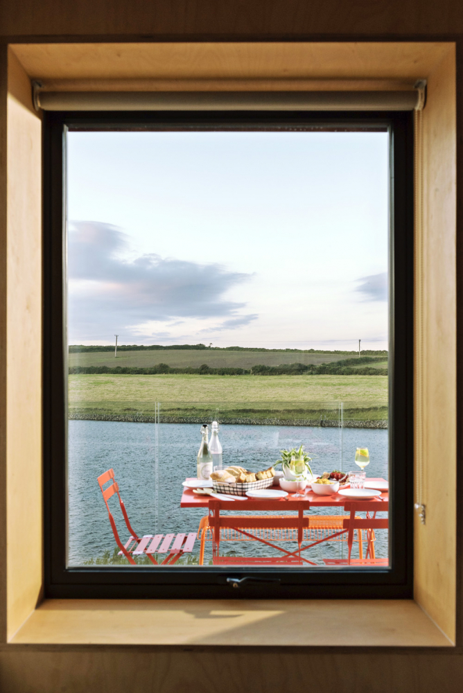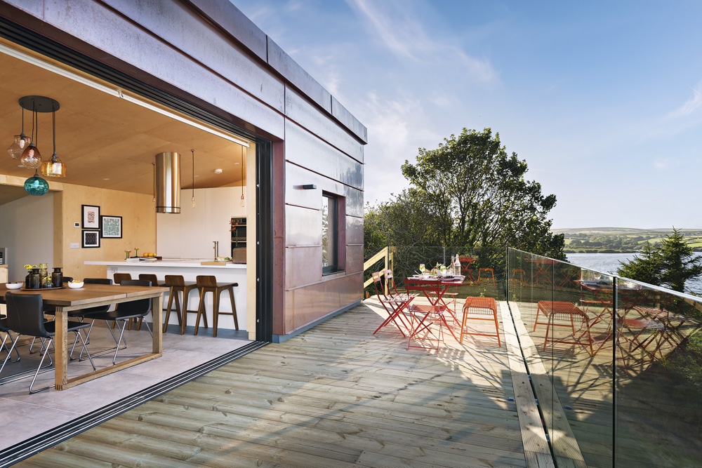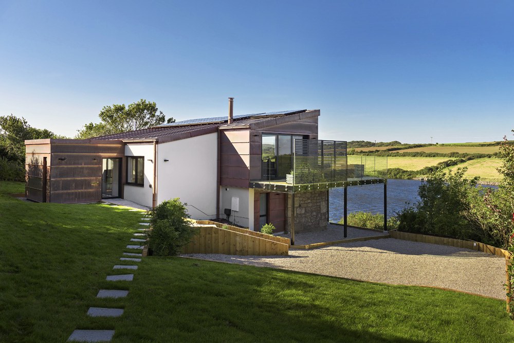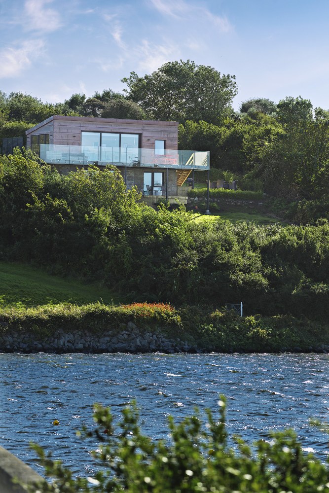 V exteriéru hojně pracuje s tradičními materiály, jako je kámen, dřevo a sklo. Odvážné je obložení domku velkoformátovými měděnými pláty, které mu propůjčují punc jedinečnosti. Domek je otevřený světlu. Velkými francouzskými okny je zajištěn nejen přístup na terasu prakticky z každého pokoje v domě, ale poskytují i dokonalou vyhlídku a vniká jimi záplava světla, která se odráží od vodní plochy, což ve vnitřních prostorách zaručuje maximální vzdušnost.