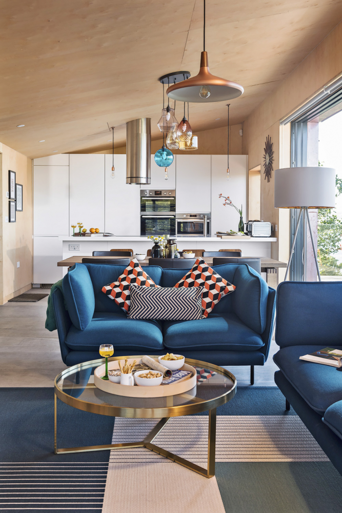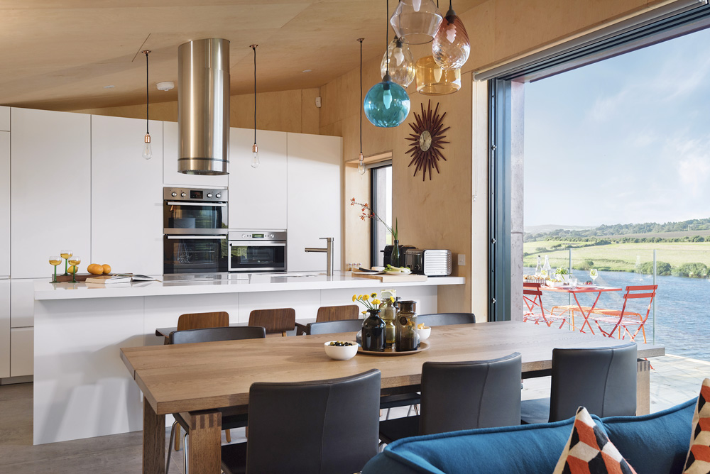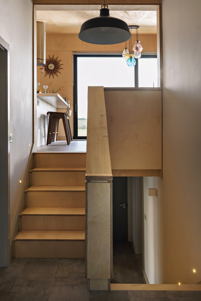 Domek nevypadá nijak velký, přesto poskytuje dostatek prostoru a i pro početnou rodinu. Kuchyň je nenápadná, plně vybavená moderními spotřebiči a s množstvím úložných prostor. Na ní volně navazuje společenská zóna zahrnující jídelní a obývací část.