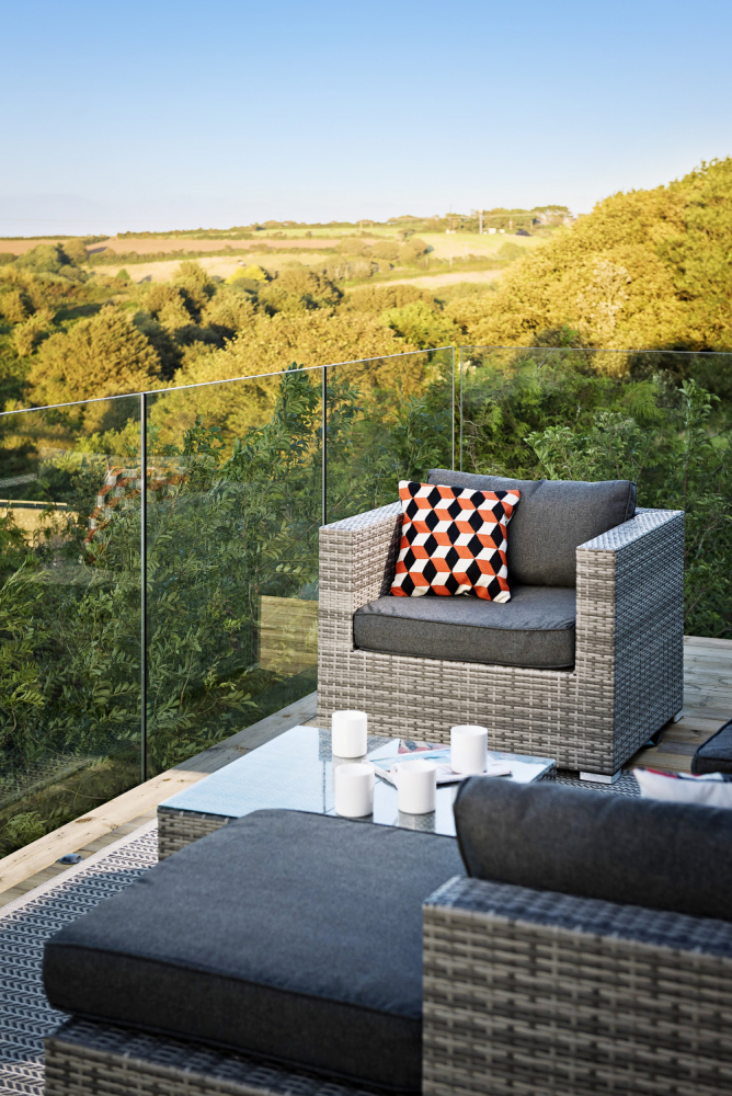 Horní terasa poskytuje fantastický panoramatický výhled, který neruší nic, ani zábradlí vyvedené ze skleněných desek. Otevřením velkého francouzského okna ji lze propojit s obývacím pokojem, odpočívat tu můžete u snídaňového stolku nebo na měkkých polštářích sedačky z umělého výpletu. Spodní terasy vizuálně propojují dům s okolní přírodou.
