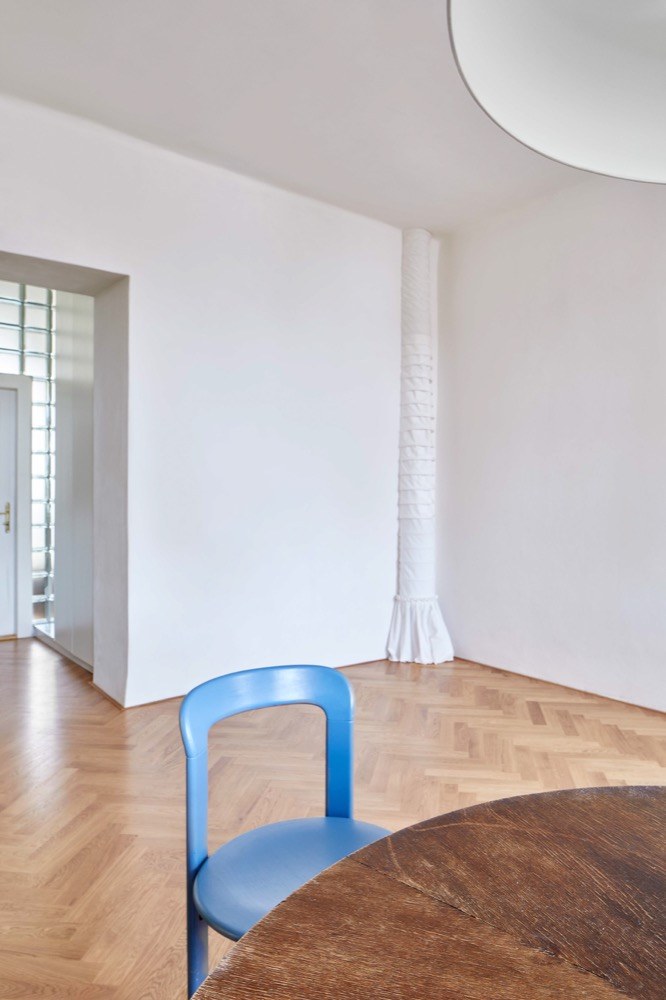 V interiéru bytu je možné nalézt řadu dalších netypických prvků jako je betonové, závěsné svítidlo nebo skříňové úchytky, které pár společně vytvořil ve své dílně. V celku se tak byt jeví jako citlivá kombinace původního historického interiéru se současným a lehce experimentálním charakterem nově vložených prvků.