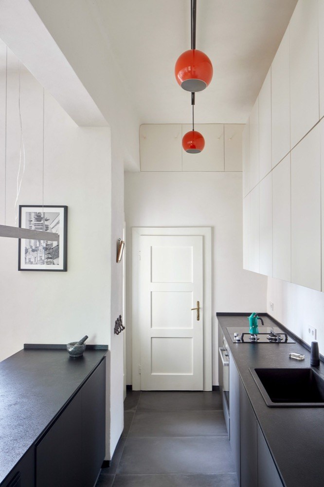Nestandardně vysoké kuchyňské skříňky jsou v horní části využívány jako sezonní úložný prostor pro celý byt. Prostor nad WC, přístupný z kuchyně, je taktéž využíván jako sklad. Kuchyňská linka s pracovní deskou je provedena v černo-šedé. Opticky se tím propojuje s podlahou kuchyně.