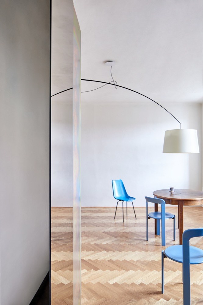 Novým rozložením pokojů a obohacením interiéru o atypické prvky vznikl prostorný, moderní byt. Nejvýraznějším prvkem bytu je bezpochyby duhová šatní skříň, která mění barvy při každé změně světla v místnosti. Zaujme i luxferová koupelnová stěna, odhalující nahé siluety ve sprše nebo na míru vytvořená turnýra a závěsy s kukátkem. Nově vzniklý interiér je kombinací historického rázu se současným lehce experimentálním charakterem.