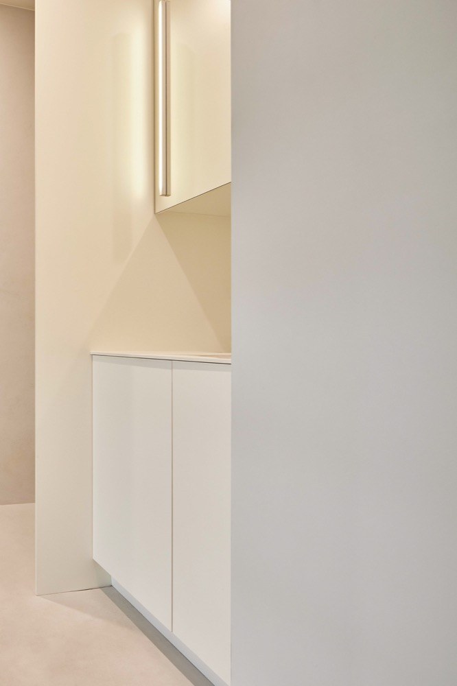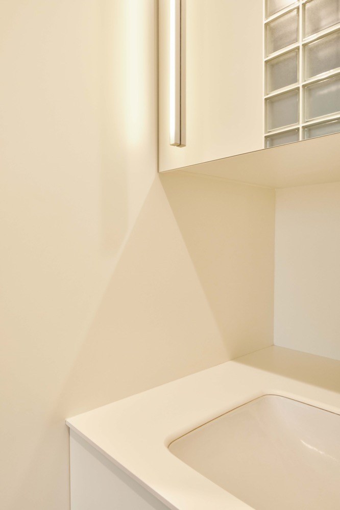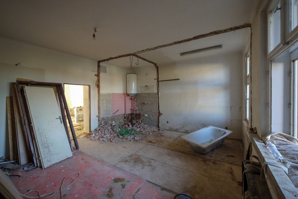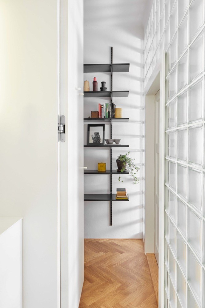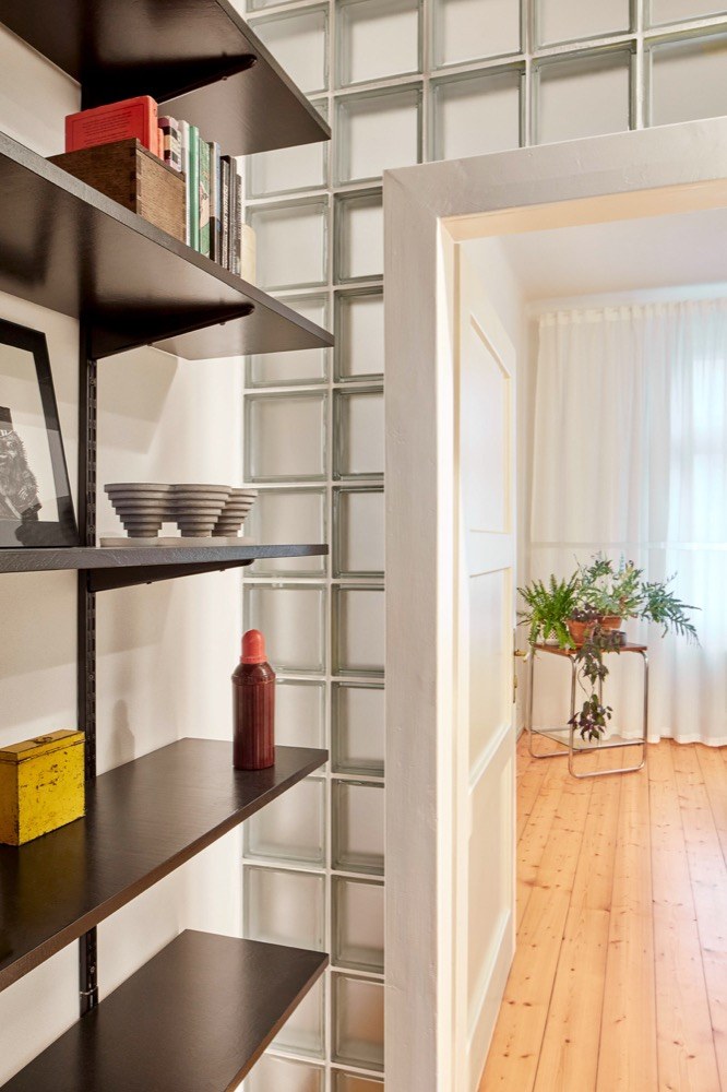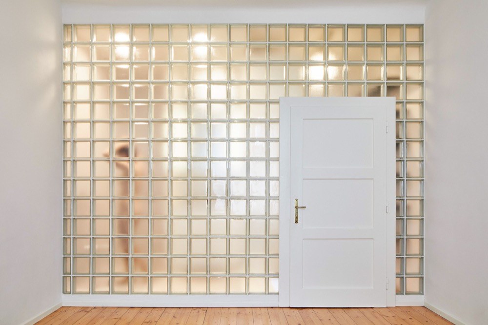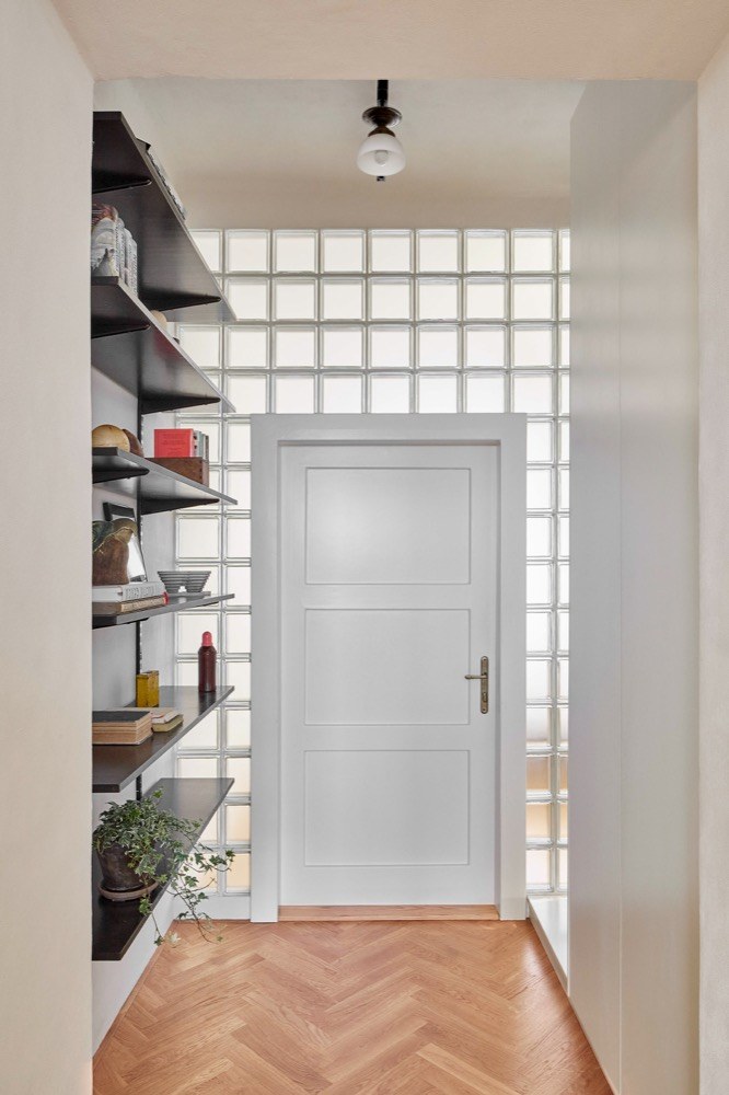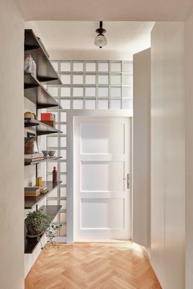 Kompletní rekonstrukce bytu v historické zástavbě v Praze-Nuslích znamenala především změnu původní, nevyhovující dispozice poplatné stylu bydlení z 1. pol. 20.st. Dlouhý, ale úzký obývací pokoj je nově rozdělen na ložnici, koupelnu se sprchovým koutem a malou knihovnu. Nová příčka mezi ložnicí, knihovnou a koupelnou je vyzděna ze skleněných tvárnic, díky nimž je koupelna prosvětlena denním světlem i přes to, že nemá vlastní okna. Skrz chodbu s knihovnou prostupuje světlo z ložnice dále do středu dispozice. Skleněné tvárnice nejsou čiré, ale pískované. Zajišťují dostatek světla, ale i soukromí v koupelně. “Siluety nahých postav jsou znatelné, ale rozmlžené, cenzurované.” usmívá se architekt Ondřej Janků.