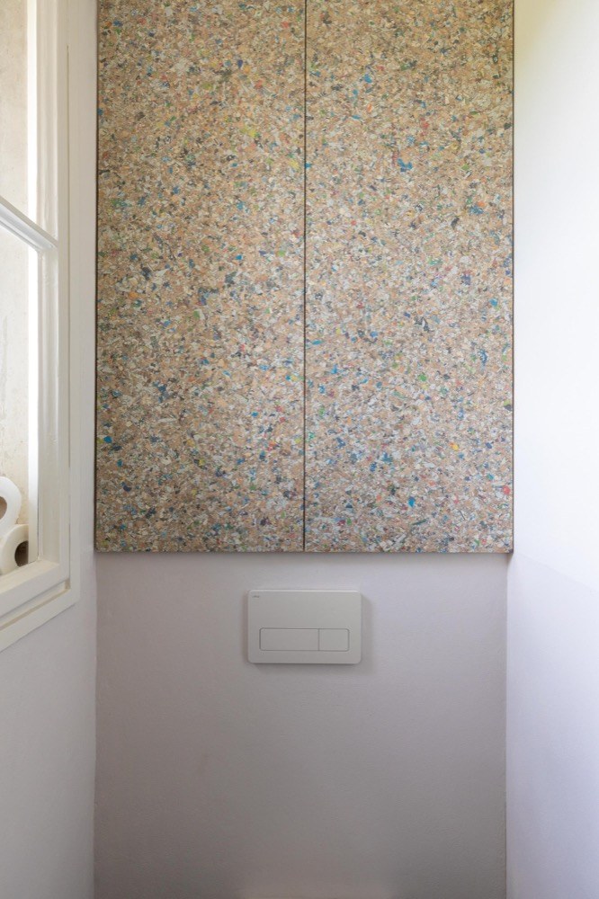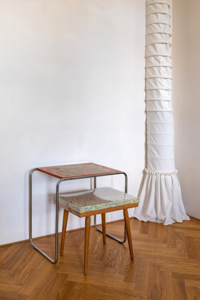 Vodovodní a odpadní potrubí v místech původní koupelny se po změně dispozice ocitlo exponované v rohu obývacího pokoje. “Rozhodli jsme se jej nezazdít do šachty, ale zakrýt na míru ušitou a umělecky provedenou turnýrou.“ Nejen že zabírá méně místa v obýváku, než klasicky vyzděná nebo sádrokartonová šachta, ale mění jinak rušivý prvek dispozice v originální umělecké dílo. Jistá stavební průzvučnost tohoto řešení navíc vnáší do interiéru kýžený akustický prvek. “Při vypouštění vany nebo pračky sousedů nad námi máme v obývacím pokoji příjemný bílý šum tekoucí vody. Není to nijak rušivé, spíše uklidňující,” chválí si nápad Ondřej.