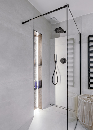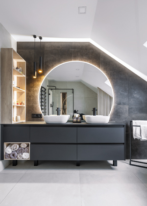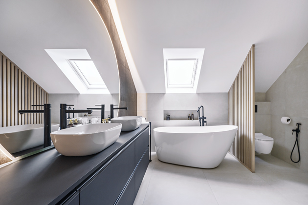 Koupelna s volně stojící vanou a velkým zrcadlem je opravdu působivá. Jaká myšlenka byla za tímto designovým konceptem?