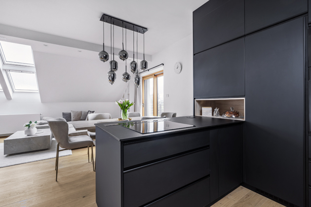 Kuchyň byla o kompromisu. Já jsem si přála ostrůvek s indukcí a varný panel na jedné straně, abych viděla do prostoru a zahrady. Partner chtěl tmavou linku. Z černé jsem měla obavy, ale černá linka v matném provedení vytvořila skvělý kontrast a teď bych si jinou barvu ani nedokázala představit.