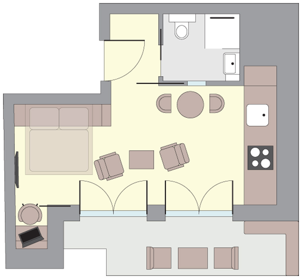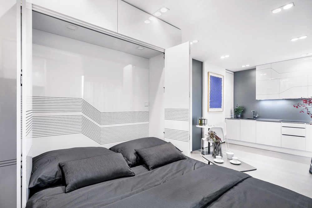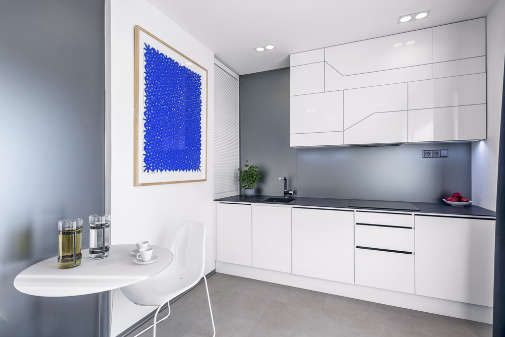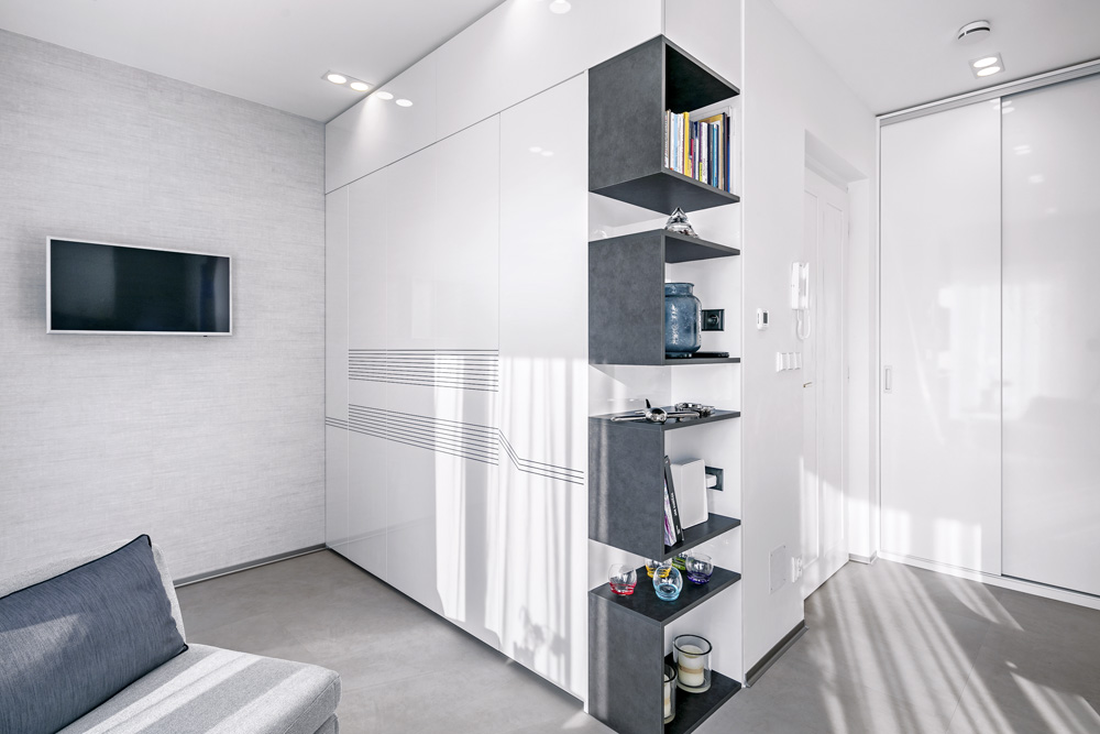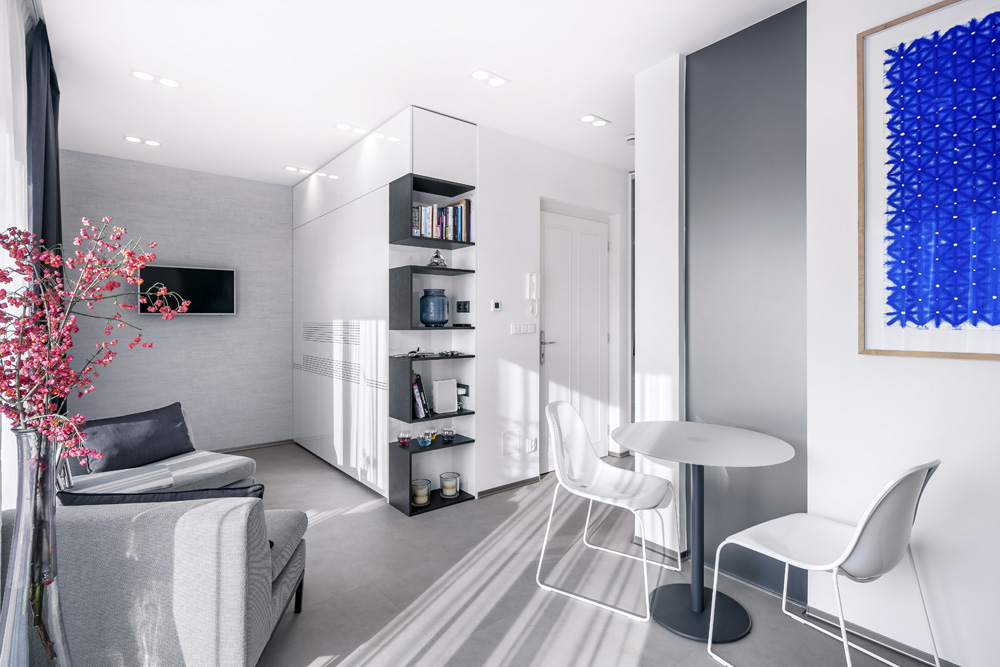Maličký podkrovní byt 1+kk doporučila designérka Markéta Killi Petrovi převzít v tzv. kolaudačním režimu, tedy ve stavu „holobytu“, a to proto, aby se nemuseli při návrhu interiéru ničím omezovat. Navzdory pouhým 25 metrům čtverečním byt nabízí velkorysý prostor.