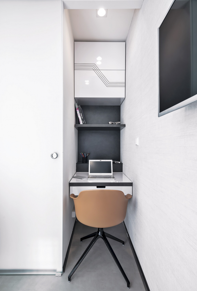 Společným prvkem jednotlivých částí bytu jsou tenké, tmavě šedé linky. Jejich kombinaci a různé zkosení použila Markéta pro design horních skříněk kuchyně, pracovní kout a nábytkovou stěnu ukrývající zabudovanou sklopnou postel.