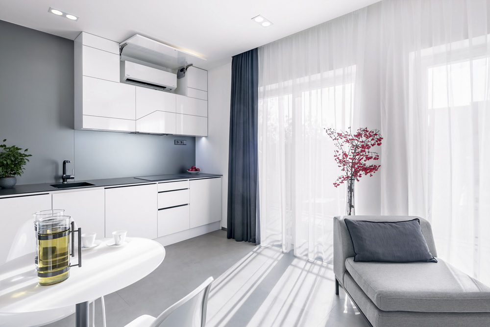 Světlý nábytek, použitý v celém bytě, pomohl interiér opticky zvětšit. Velmi čistým dojmem působí strop, do kterého je zapuštěno jak bodové osvětlení, tak uchycení záclon a závěsů. Prostor malého bytu tak nezabírají žádné výrazné garnýže. Za zmínku stojí i pěkná podlaha sestavená z béžových vinylových dílců od studia Amadeo.