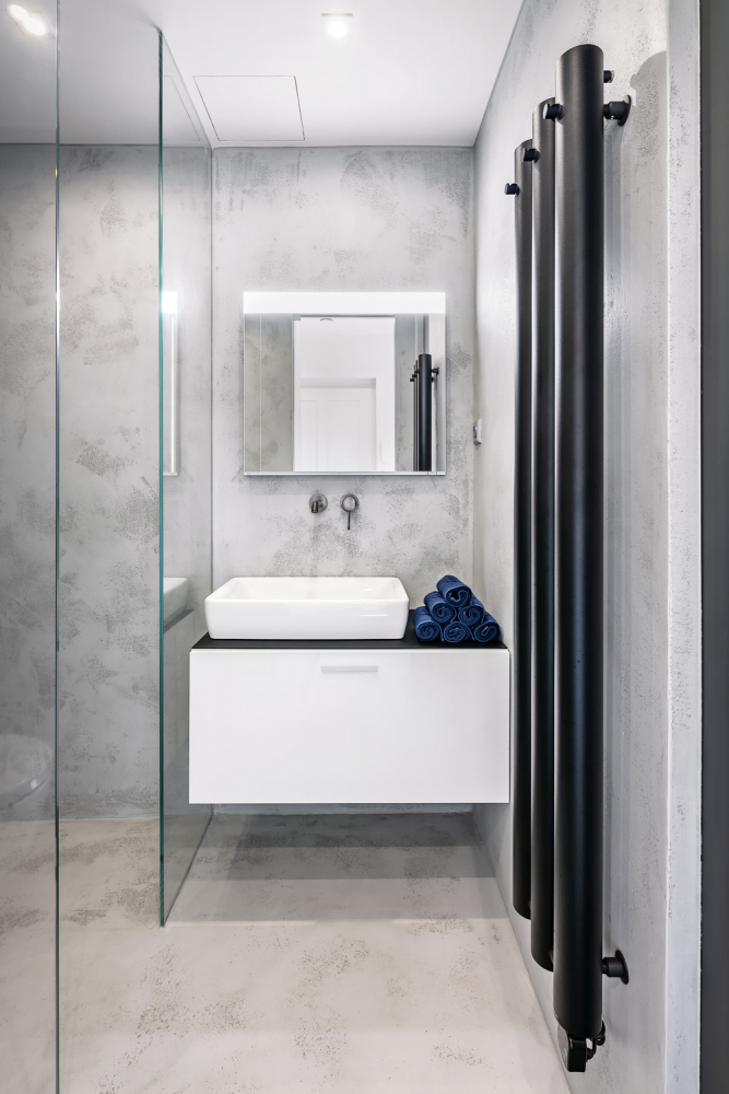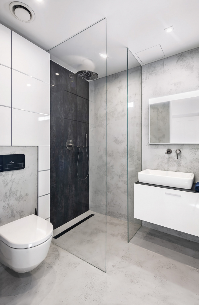V koupelně použila designérka na povrchy stěn a podlahu ve velké míře světlou epoxidovou stěrku a kontrastní grafitové baterie značky Grohe. Lehký a vzdušný dojem koupelny podtrhují skleněné posuvné dveře, ukryté v sádrokartonové příčce. Výrazným solitérem bytu je obraz od malíře a sochaře Františka Kyncla.
