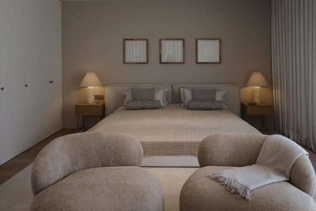 Foto: WestwingPrvky obývacího pokoje byly pečlivě vybírány a uspořádány s důrazem na kombinaci stylů a materiálů: „Myslím, že textura je v obývacím pokoji mimořádně důležitá. Líbí se mi kontrast s kamennými stolky. A jak můžete vidět, rozmístění je poměrně symetrické, což, alespoň podle mě, vytváří pro hosty velmi uvolněnou atmosféru.“