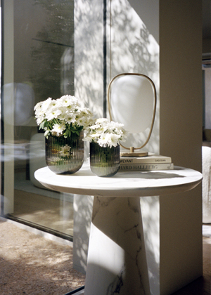 Otevřený obývací prostor je Deliinou oblíbenou částí domu. V této zóně se odráží styl domu, který zakladatelka Westwing popisuje jako „zen s nádechem glamouru“. Dekorace jsou pečlivě vybrané a zahrnují pochromované doplňky, průhledné prvky a cestovatelské suvenýry. „Miluji slony, můžete najít malé sošky slonů téměř po celém domě.“ Většina nábytku, říká Delia s hrdostí, pochází z kolekce Westwing: „Některé doplňky a menší nábytek jsou odjinud, ale všechny větší kusy v tomto prostoru jsou z naší kolekce, a to mě opravdu těší.“