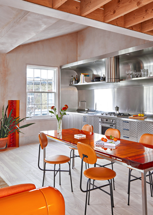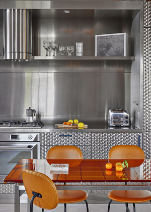 Vzhledem k tomu, že v portfoliu studia najdeme i několik realizací v oblasti pohostinství, není divu, že návrhu kuchyně věnoval Alex Holloway důkladnou péči. Při navrhování kuchyně hledal inspiraci u místních provozoven rychlého občerstvení. Cílem návrhu bylo zachytit a zároveň oslavit atmosféru typickou pro noční vycházky do lokálních rychlých občerstvení za tím nejlepším, co zdejší kuchyně nabízí. Kdo nikdy neochutnal fish & chips na rušné londýnské ulici v čase po půlnoci, jako by nezažil pravý Londýn. Kuchyň z nerezové oceli ve spojení s elegantně provedenými křivkami zadní stěrky tvoří v místnosti zcela neopakovatelný moment – jedná se o designové spojení kosmopolitní DNA současného Londýna a hlavního města očima malého Alexe, když zde vyrůstal.