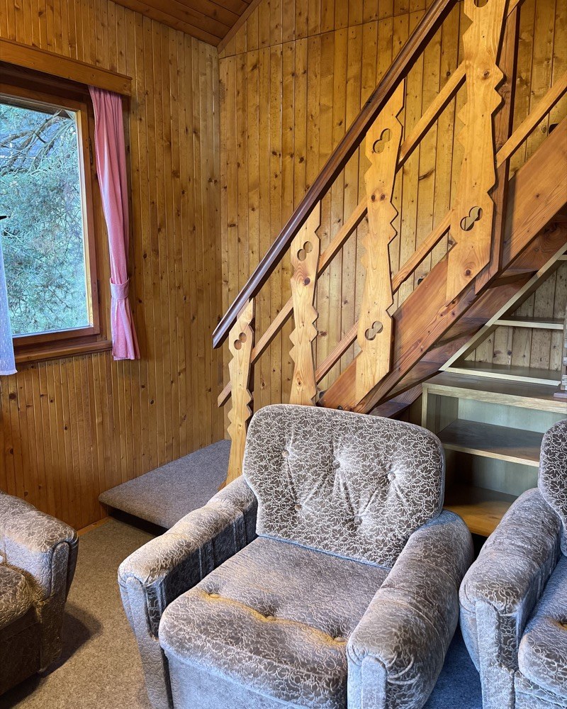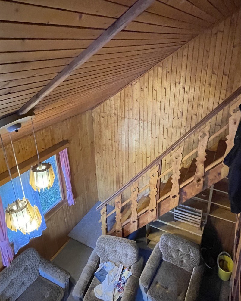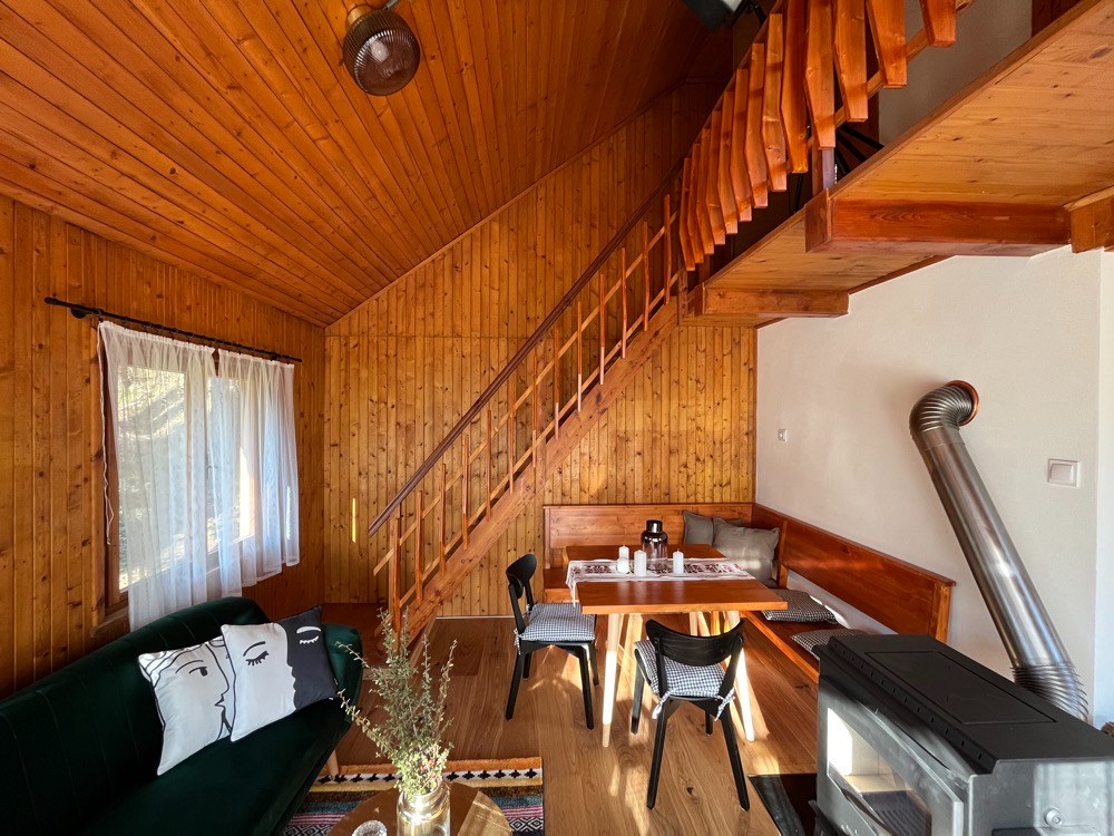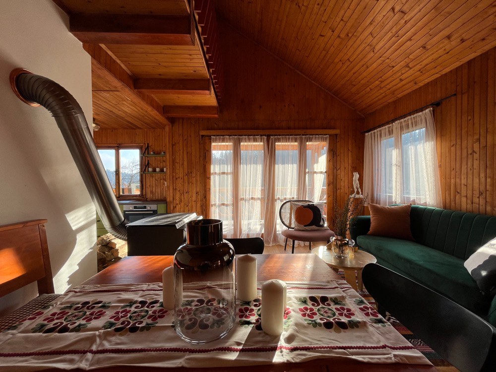Novému majiteli nevyhovuje rozvržení vnitřního prostoru chaty ani jeho aktuálním potřebám. Jeho rodina se postupně rozrůstá, a i kvůli epidemii koronaviru, která těžiště jeho práce přesunula spíš do domácího prostředí, by rád upravil chatu k delším pobytům, než jsou současné víkendové návštěvy. Cílem proměny tedy bylo hlavně zlepšit dispozici, aby tu majitelé měli víc prostoru. Místo někdejší stísněné nudle teď mají kuchyň, kam se pohodlně vejdou dva lidé, mají i komfortní koupelnu. Původní krb byl příliš velký a neefektivní, nahrazen byl výkonnými kamny. Architekti se snažili zachovat co nejvíce z atmosféry 70. let, která interiérem prostupovala. Proto právě zelená kuchyně. Před půlstoletím měly linky s plechovými dvířky barvy v paletě bledě modré, světle růžové nebo světle zelené. Okno nad pracovní deskou vede na terasu – tohle těsné propojení si majitelé moc pochvalují.