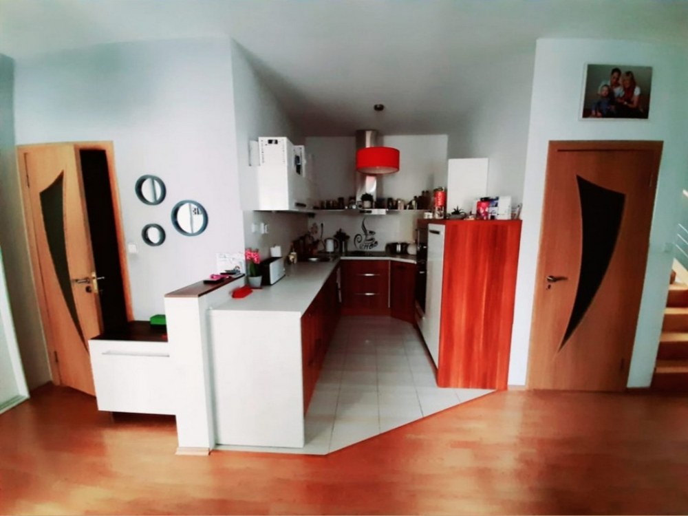 Poslední přišla na řadu rekonstrukce chodby a kuchyně. Ke sjednocení a optickému zvětšení místností byla v tomto prostoru vybrána béžová vinylová podlaha. Před pokládkou vinylu se musela podlaha nejprve vylít a zarovnat. V chodbě pak došlo k výměně dveří, aby byly ve stejném dekoru jako dveře do ložnice. Původní bílý radiátor se nalakoval na černo.