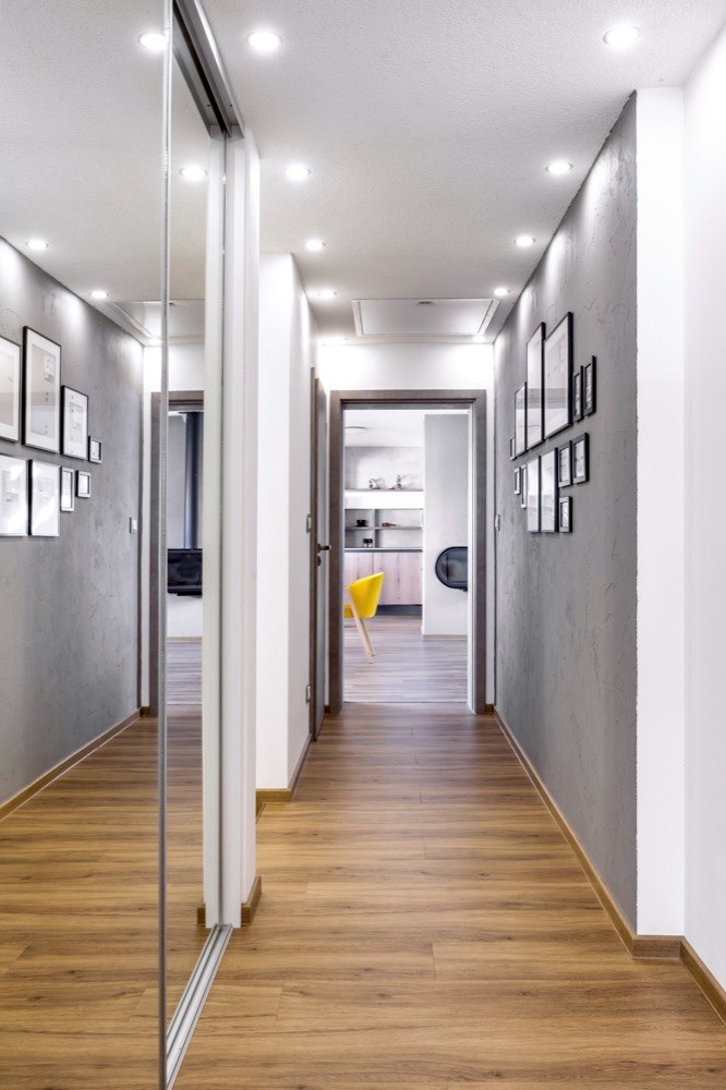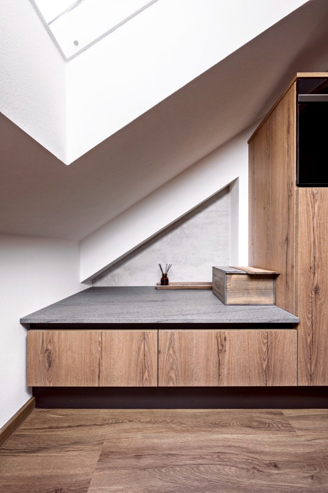 Nyní je v podkrovním bytě s rozlohou 125 metrů jedna velká obytná místnost plnící funkci obývacího pokoje a kuchyně s jídelnou. Dalšími místnostmi jsou ložnice, dva pokojíky a dvě koupelny. Manželé mají rádi méně věcí, kvalitní materiály a zemité přírodní barvy. Nosnou myšlenkou tedy bylo vytvořit si bydlení, které bude tak trošku minimalistické, bez většího množství nepotřebných věcí, které by rušily. Zároveň měly být v bytě použité materiály, jež prostory zabydlí a zútulní. Byt měl být také maximálně funkční, účelný a v moderním hezkém designu. Jako základ barevného konceptu byla vybrána šedá barva v kombinaci s tmavším dřevem.