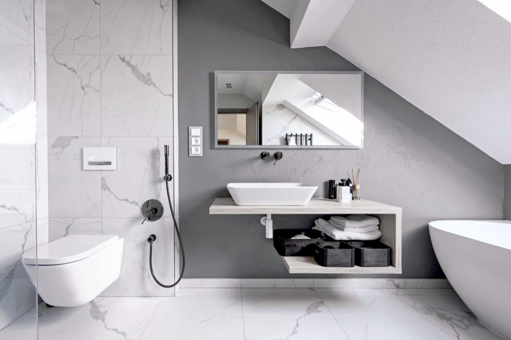 Inspiraci čerpali manželé na Pinterestu, v časopisech a pomohl jim i veletrh nábytku a bytových doplňků FOR INTERIOR, kde se třeba na stánku firmy Aksamite zamilovali do sedačky z buvolí kůže. Ta byla ovšem za jejich finančním limitem a dokonalou sedačku na míru jim pak sestavili až v prodejně. Stejné to bylo i s jídelním stolem a židlemi, ty také objevili na veletrhu u ostravské firmy Belterra a v showroomu jim pak dobře poradili s konkrétním výběrem. Ještě než ale pořizovali solitérní nábytek, kvůli koordinaci stavebních prací bylo nutné co nejdříve vybrat kuchyň. Do hlavní obytné místnosti si na internetu našli italskou kuchyň značky Arredo3. Ve studiu si padli do noty s návrhářkou, pro kterou byla kuchyň zakomponovaná pod šikminu zajímavou výzvou. Návrhářka nabídla materiál lamino v imitaci dřeva, jež hezky ladí s laminátovou podlahou v podobném dekoru. Kuchyň situovanou do tvaru písmene L ještě doplňuje pracovní ostrůvek. V podkroví jsou dvě koupelny, s jejichž zařízením se majitelé obrátili na studio Senesi. Šli tam s jasnou myšlenkou, kterou na místě poupravili. Oříškem prý bylo nastěhovat do koupelny vanu z litého mramoru. Zásadní byl pro majitele i výběr komfortní postele, proto zvolili vysoký kontinentální typ, který si vybrali u firmy ProSpánek.