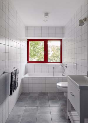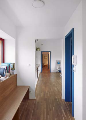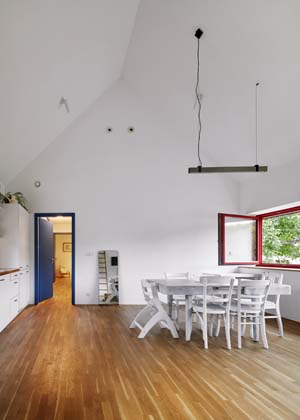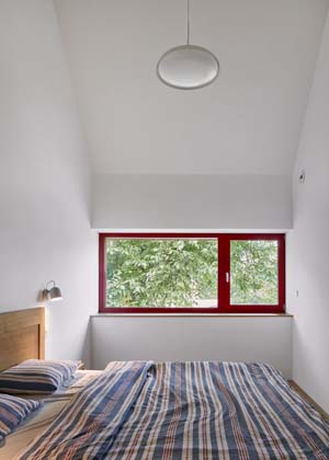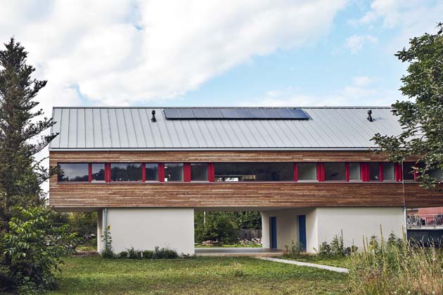 Z fotografií je jasné, proč tomu tak je. Stavba je vynesena na dvou betonových podstavách, které ji chrání před povodněmi a zároveň jsou výrazným architektonickým prvkem. Mezi podstavami také vznikl poměrně velký krytý venkovní prostor. Dům má tradiční sedlovou střechu, fasáda je tvořená dřevěným obkladem ladícím s okolní zástavbou i krajinou. Jižní strana domu je prosklená. Pásové okno po celé délce domu na této straně poskytuje nádherný výhled do zahrady a na okolní krajinu. Hravými barevnými prvky jsou červená okna a modré dveře, jež dodávají stavbě osobitý charakter.