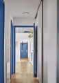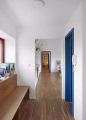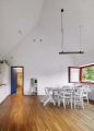 Schodiště vede do prvního patra, kde se nachází hlavní obytná část domu. Všechny obytné místnosti jsou orientovány na jih a procházejí podél pásového okna. Hlavní chodba propojuje čtyři pokoje, obytnou místnost a dvě koupelny. Obytné místnosti využívají vysokého otevřeného podkroví, které tak nabízí dostatečně velké plochy a celému interiéru dodávají na vzdušnosti.