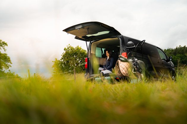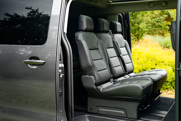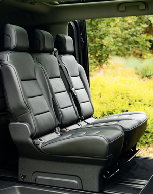 Pro přepravu osob je samozřejmě klíčový počet sedadel. Těch může být až devět a nespočet způsobů, jak je uspořádat. Dají se posouvat, sklápět i úplně vyjmout. V luxusnější verzi „VIP Pack“ si můžete vytvořit uspořádání ve stylu obývacího pokoje, se čtyřmi nezávislými sedadly proti sobě a s nadstandardní výbavou. Ta zahrnuje například automatickou dvouzónovou klimatizaci, přídavnou stropní klimatizaci s osvětlením nebo panoramatické okno s protislunečními clonami. Chtějí-li cestující využít jízdu k práci či k relaxaci, přijdou jim vhod výklopné stolky ve druhé řadě či zabudované roletky. Za zmínku stojí také mimořádně komfortní nastupování do vozu. Posuvné boční dveře se ovládají elektricky, a navíc mají hands-free přístup umožňující jejich bezdotykové otevření. To oceníte například při usazování dětí do autosedačky nebo při nakládání zavazadel. Rodiny s více dětmi ocení fakt, že i v bezpečnostních sedačkách pohodlně usadíte tři děti vedle sebe!